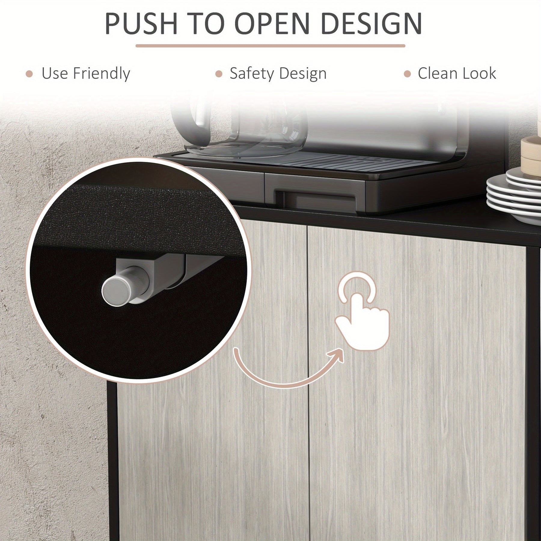 This modern sideboard combines sleek design with versatile storage solutions, perfect for kitchen or living room organization. Crafted from durable hardwood and engineered particle board, it features four doors and two cupboards with adjustable shelves to accommodate items of varying sizes. The solid wood legs provide sturdy support and a timeless aesthetic, while its black and grey finish complements contemporary interiors. Floor-mounted for stability, this piece offers both functional storage and refined style, enhancing your space with quality craftsmanship and thoughtful design.