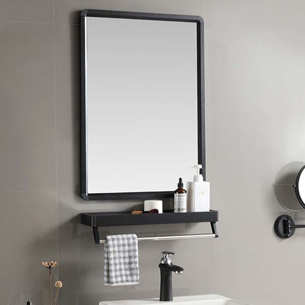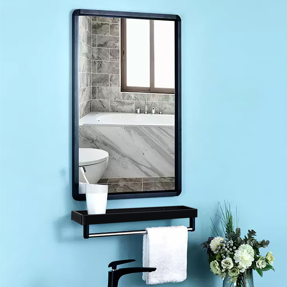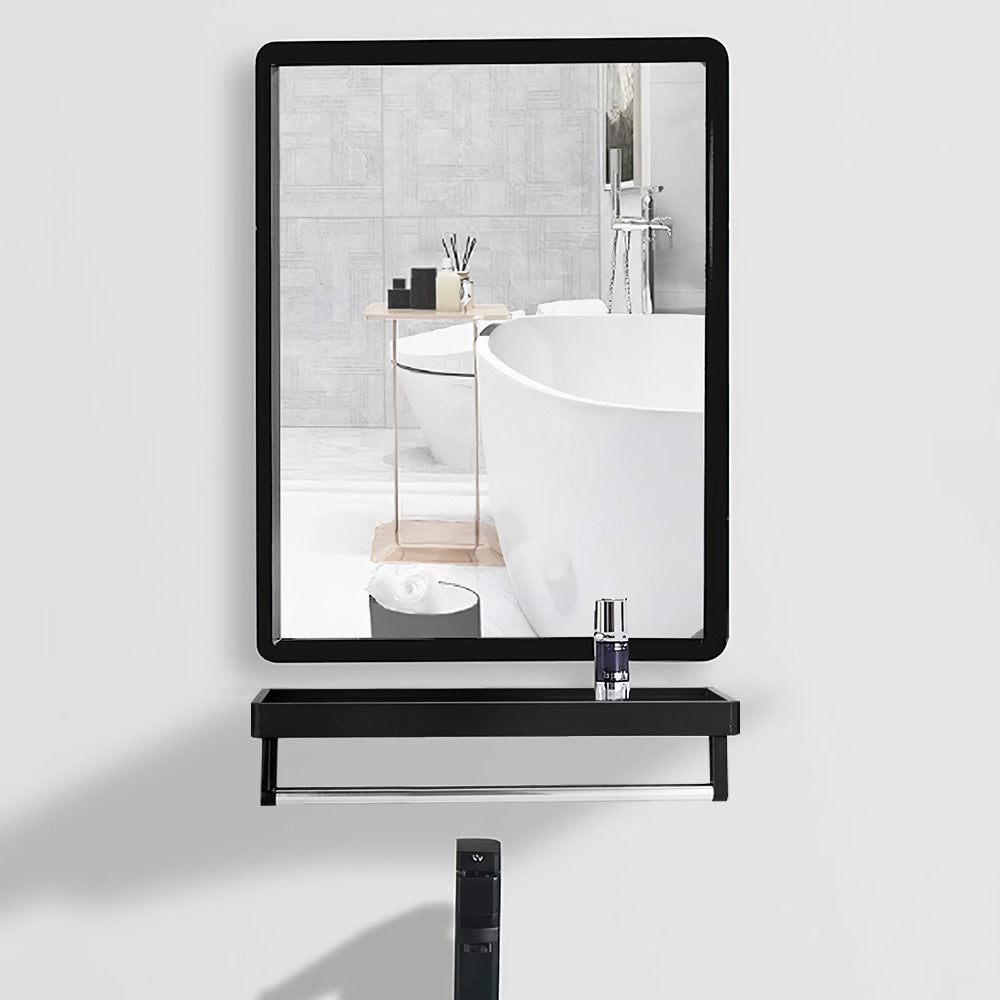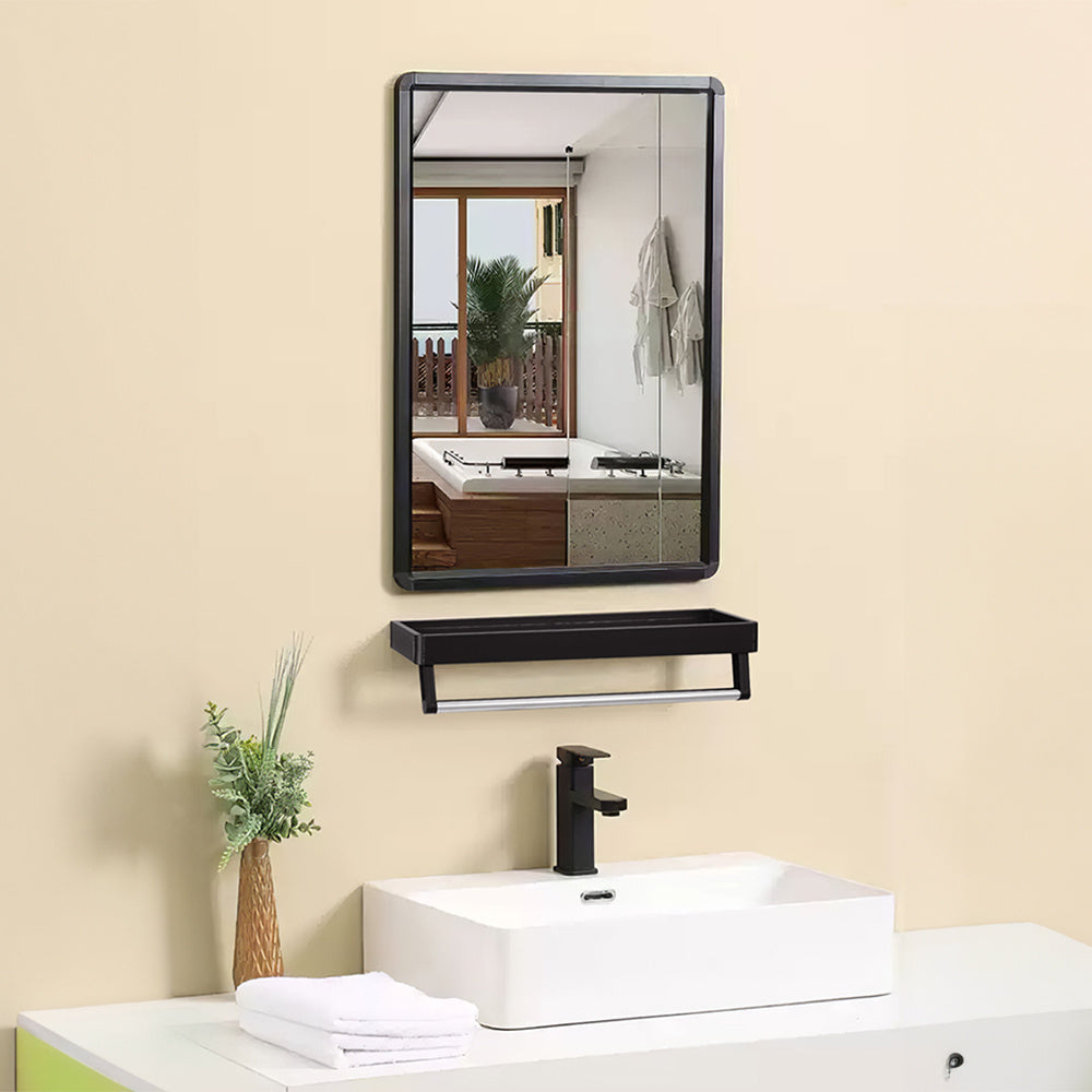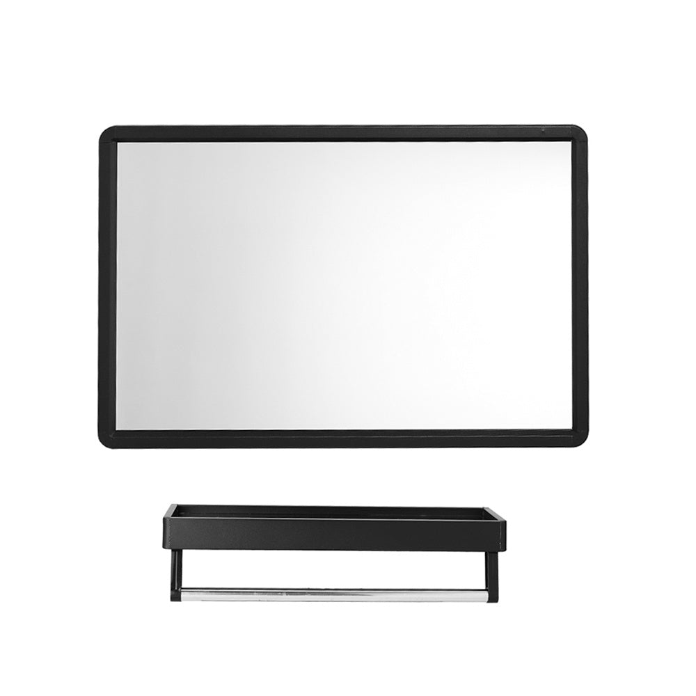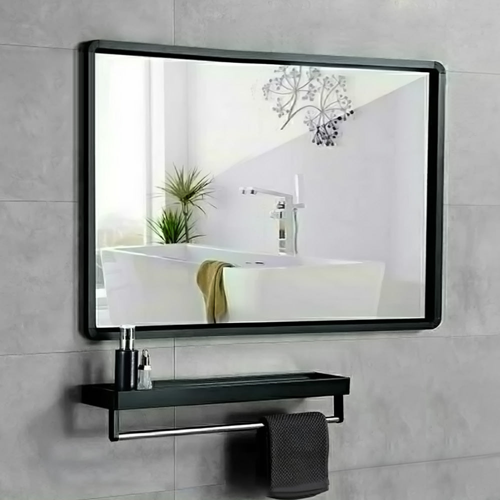 This 600 x 400mm rectangular bathroom mirror features rounded corners and a sturdy shelf rack for added storage. Designed to mount on the wall either horizontally or vertically, it provides a clear, distortion-free reflection that enhances both natural and artificial light in any space. Constructed from glass with an aluminum alloy frame, it combines durability with a sleek, modern look. Ideal for bathrooms, bedrooms, kitchens, or living areas, this mirror adds both functionality and style to your home. The shatterproof glass ensures safety, making it a practical and elegant choice. Color: Black, Quantity: 1X Mirror & Caddy Rack Set