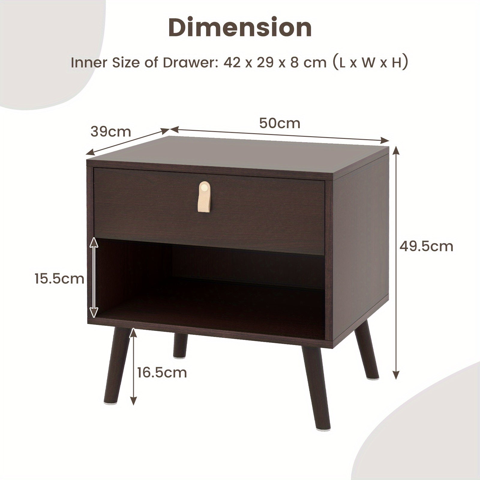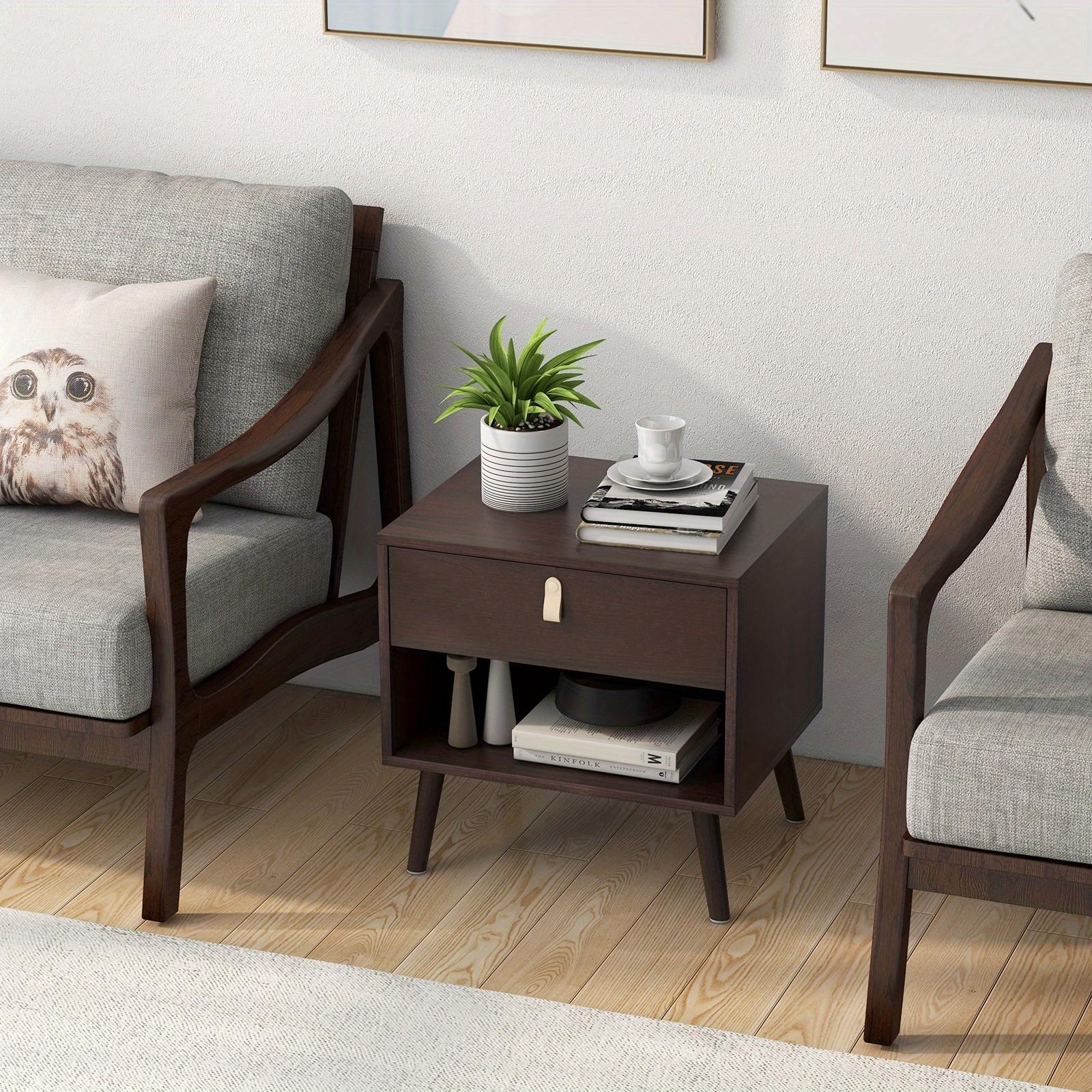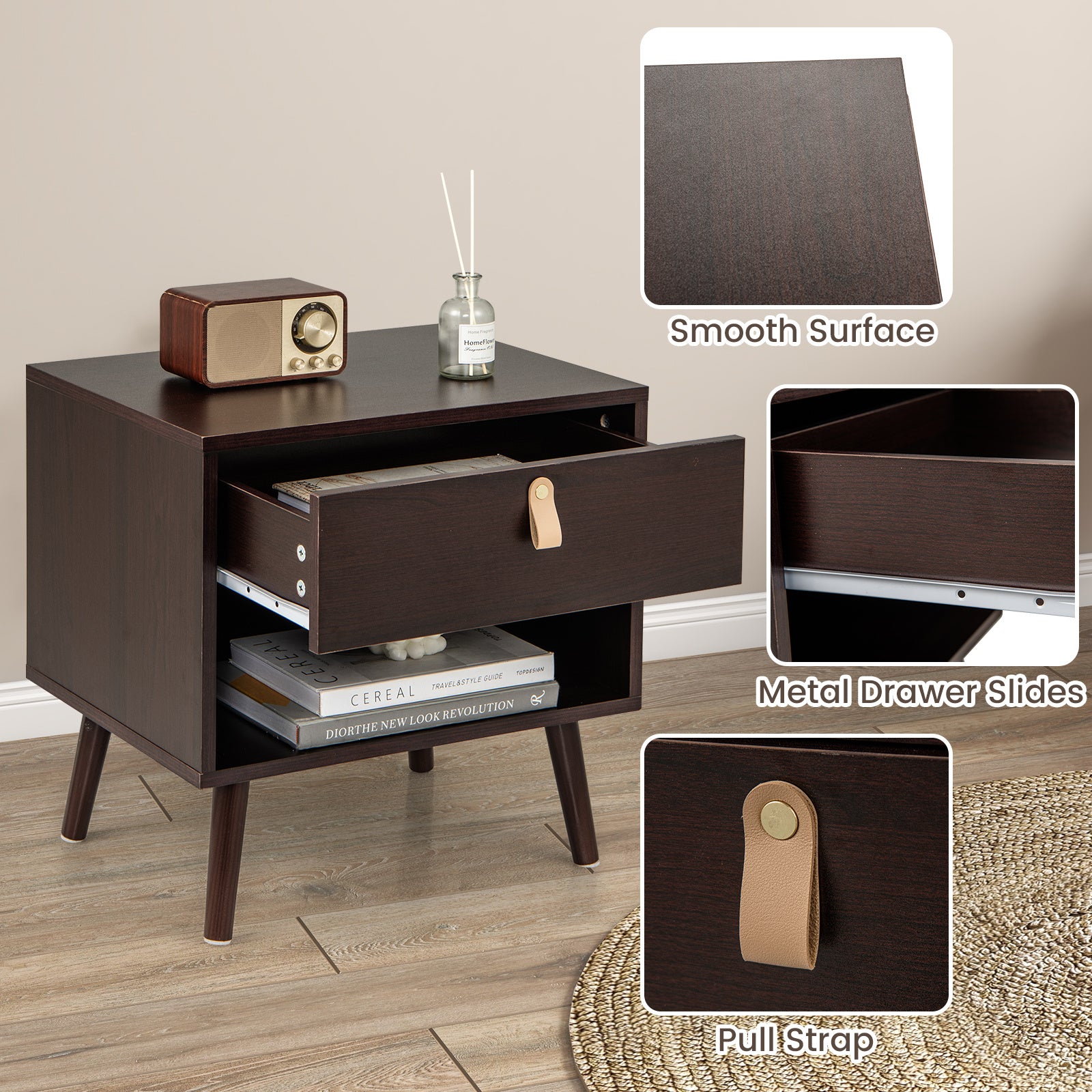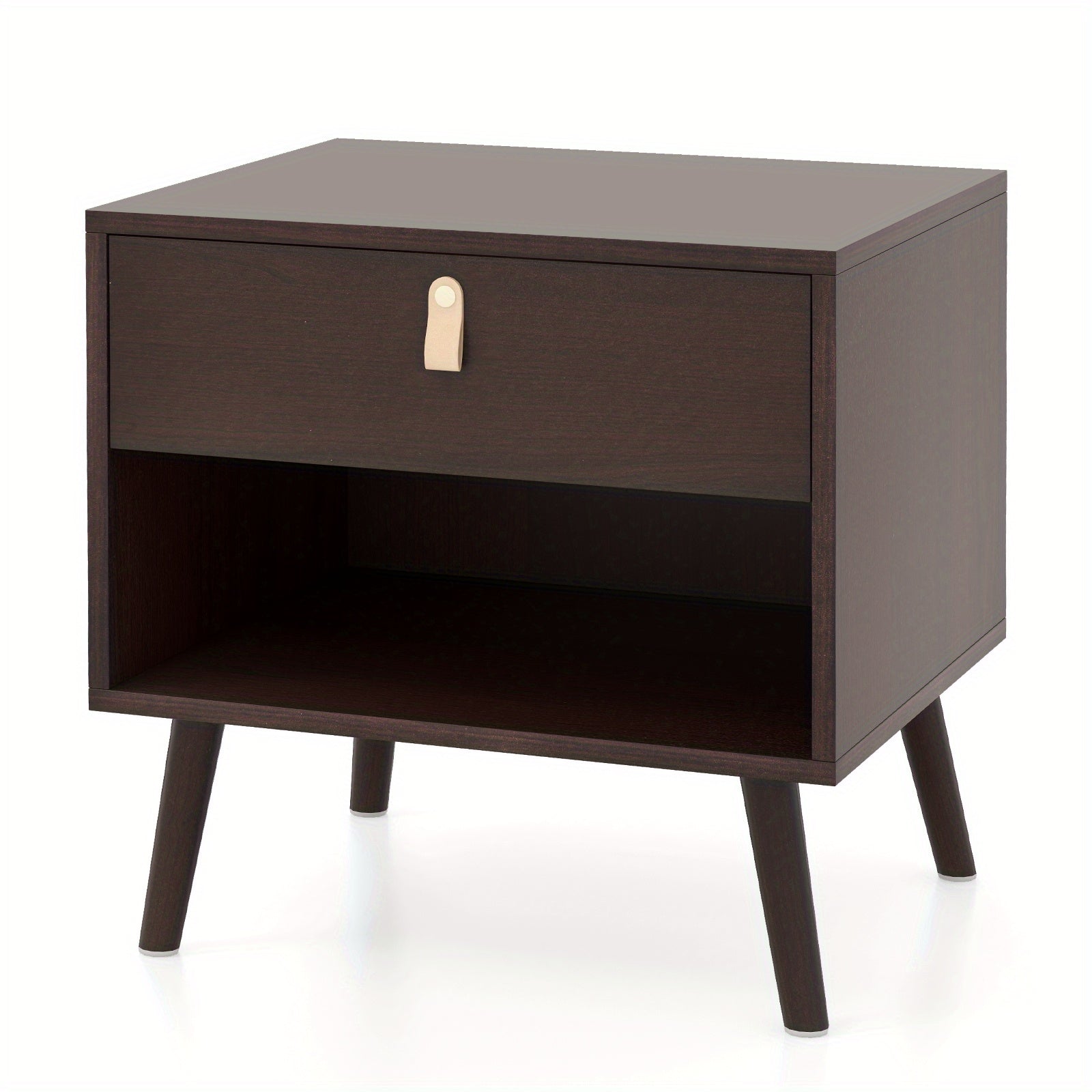 This mid-century nightstand combines style with practicality for your bedroom or living room. Featuring a spacious top surface perfect for a lamp or drinks, a smooth slide-out drawer for personal belongings, and an open bottom shelf ideal for books or storage baskets, it maximizes organization in compact spaces. Supported by sturdy solid wood legs, this three-tier bedside table offers reliable durability and timeless design. Crafted from wood and engineered particle board, its warm brown finish complements any décor while ensuring lasting stability.