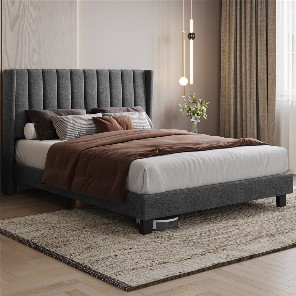 A contemporary platform bed combining refined upholstery with engineered durability. The channel-tufted headboard features distinctive wing detailing, creating visual depth and a grounded aesthetic. Built on a hardwood slat foundation that supports mattresses directly—no box spring required—this frame delivers both practicality and design sophistication. Upholstered in quality linen with reinforced metal joinery and MDF construction, it's available in versatile beige or dark grey finishes. Integrated floor protectors preserve your flooring, and the straightforward assembly process ensures minimal installation effort.