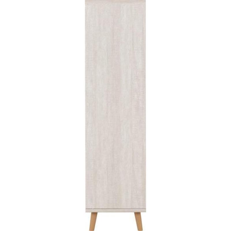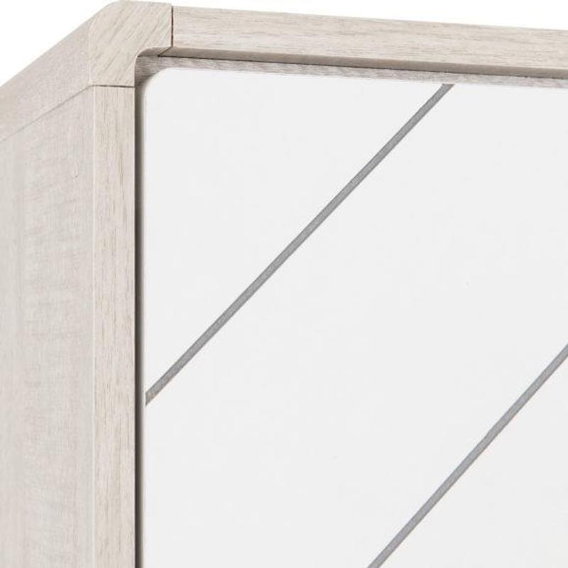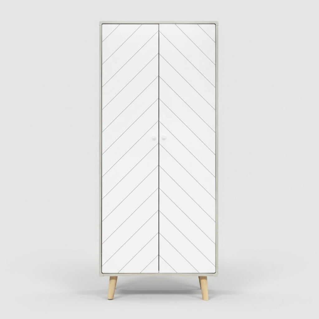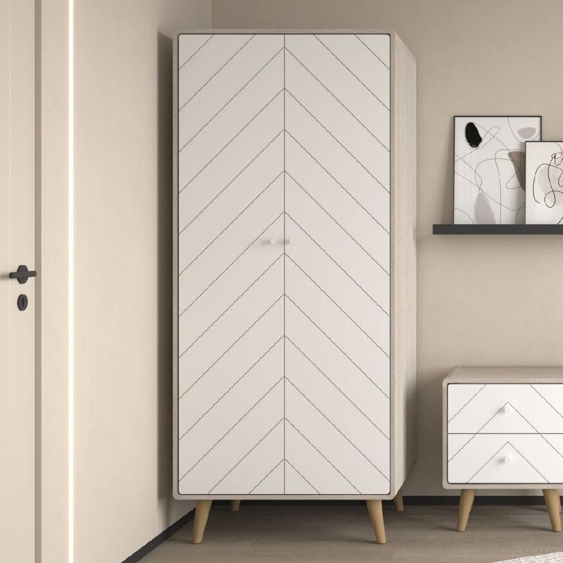 This contemporary two-door wardrobe combines practical storage with refined aesthetics, featuring a dusty grey and white finish complemented by natural wooden legs. The interior houses a robust metal hanging rail, accommodating substantial quantities of clothing whilst maintaining an organized appearance. Constructed from quality MDF fiberboard with hardwood elements, the piece arrives flat-packed for straightforward assembly. Equally suited to master bedrooms or children's rooms, it delivers functional elegance without compromise.