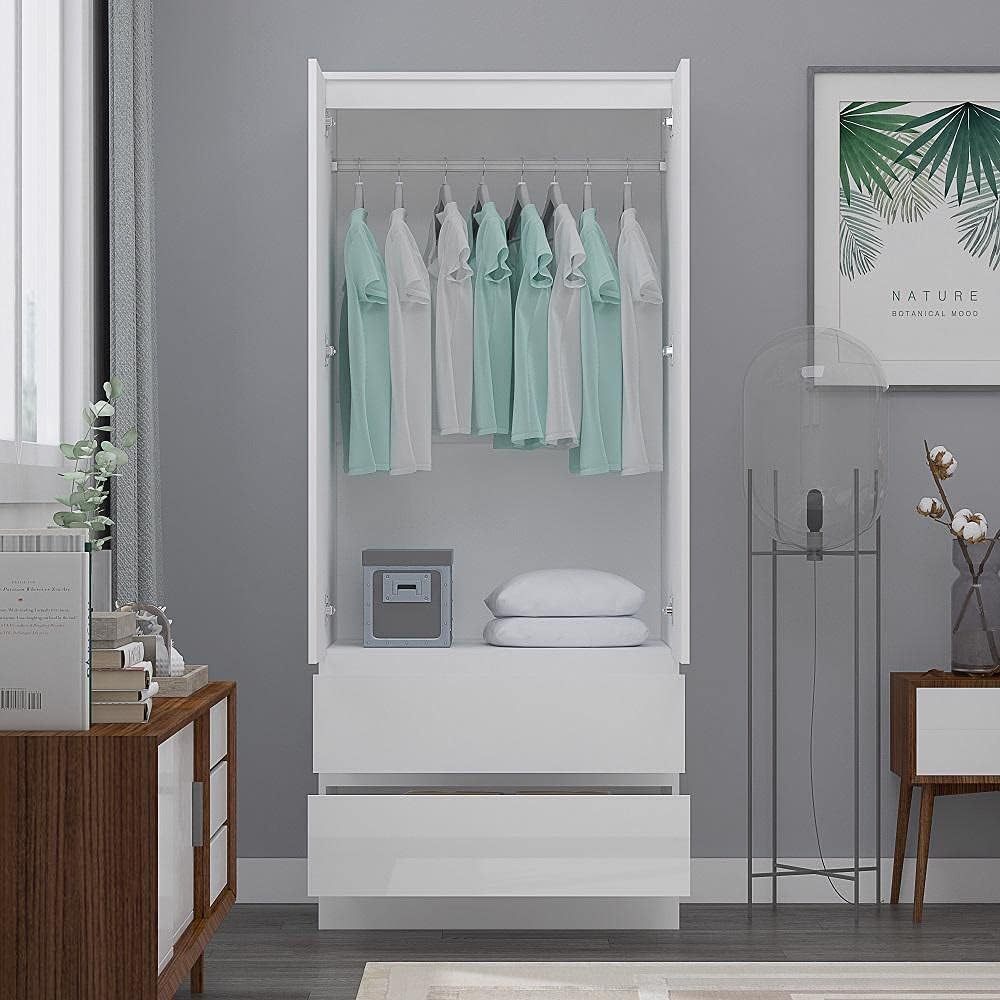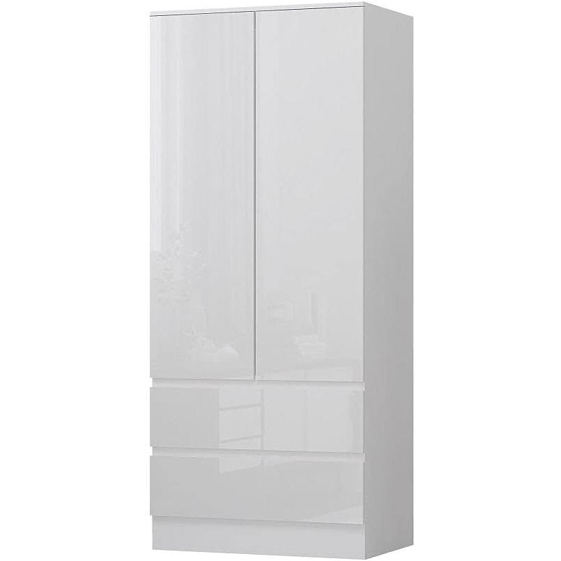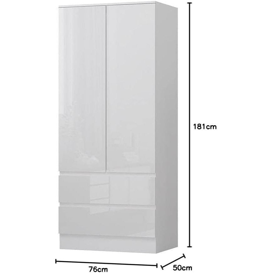 Store your wardrobe with understated elegance in this Scandi-inspired two-door combination piece. Measuring 180cm high by 80cm wide, it combines dual full-width drawers with a hanging rail behind soft-close doors—ideal for maximising bedroom storage. The minimalist push-to-open design and handle-free aesthetic create a refined, clutter-free look, whilst the contrasting gloss white doors and matt frame deliver contemporary visual interest. Engineered for longevity with metal runners, reinforced hinges, and structural bracing, this wardrobe arrives flat-packed for straightforward assembly. A practical investment in modern bedroom furniture that prioritises both form and function.