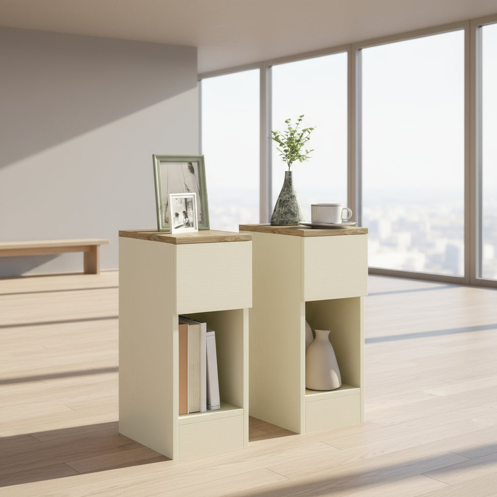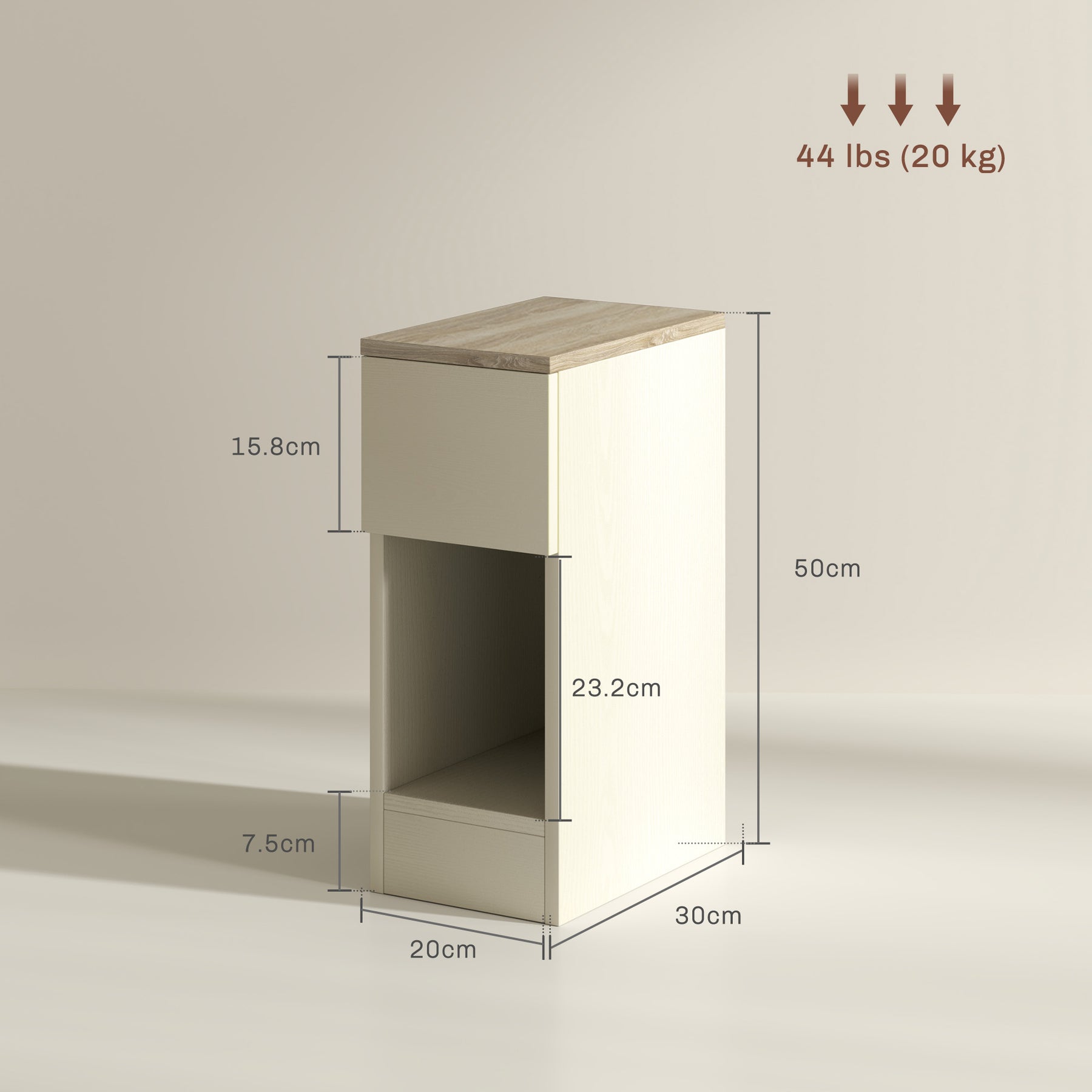 This set of two modern bedside tables combines style with practical storage, featuring a drawer, bottom shelf, and flat top for organizing essentials. Their compact dimensions (20W x 30D x 50H cm) make them ideal for small spaces, maximizing utility without sacrificing room. Designed without handles for a sleek look, these versatile nightstands suit bedrooms, living rooms, or any area needing functional accents. Built from sturdy particleboard with a melamine finish, they offer lasting durability. Each drawer measures 10H x 11.5W x 23.3D cm, with an overall weight capacity of 20kg and 5kg per drawer. Assembly is required.