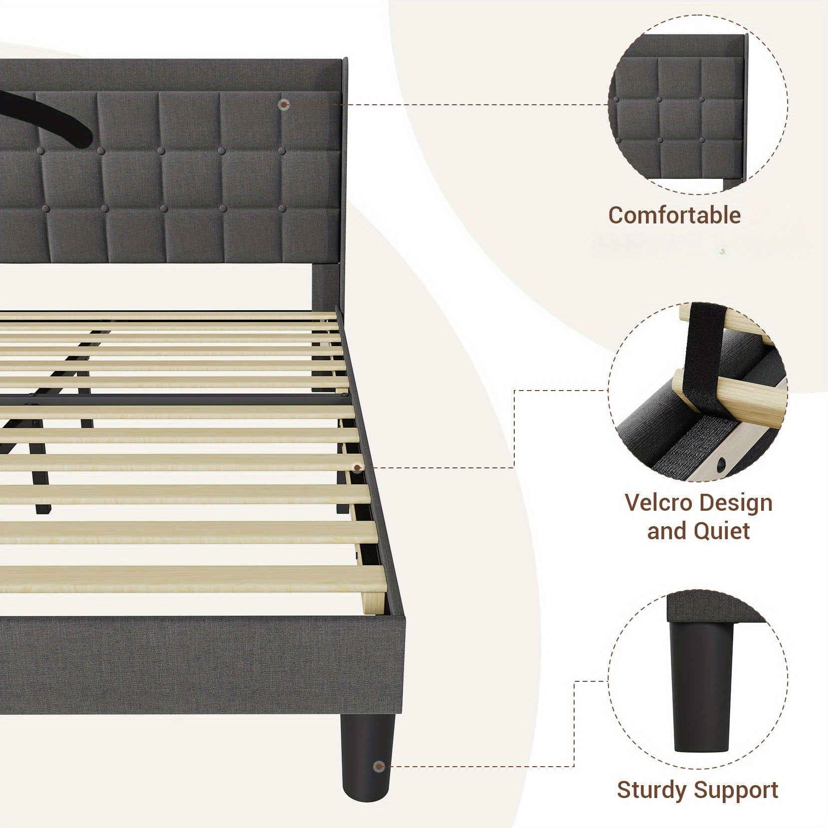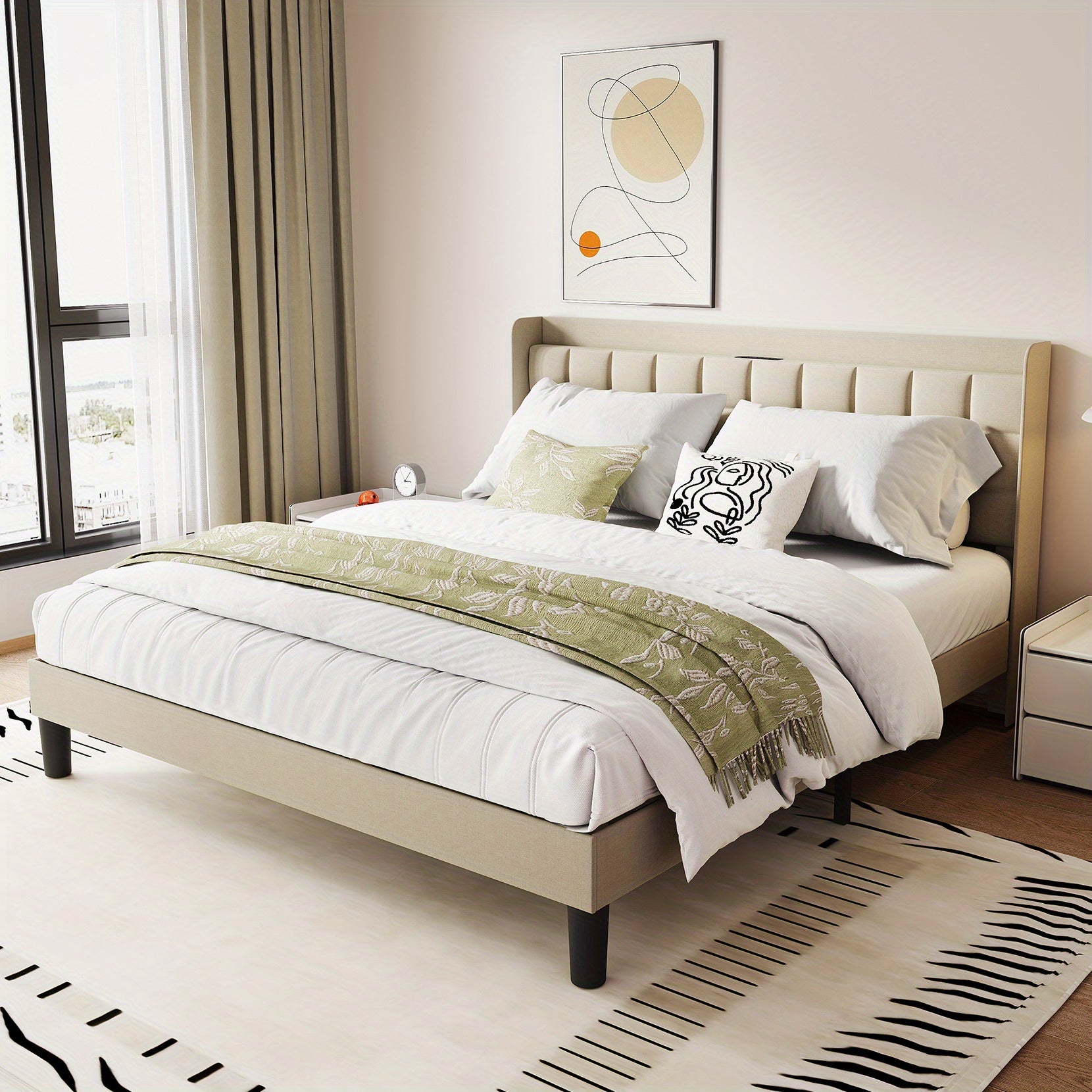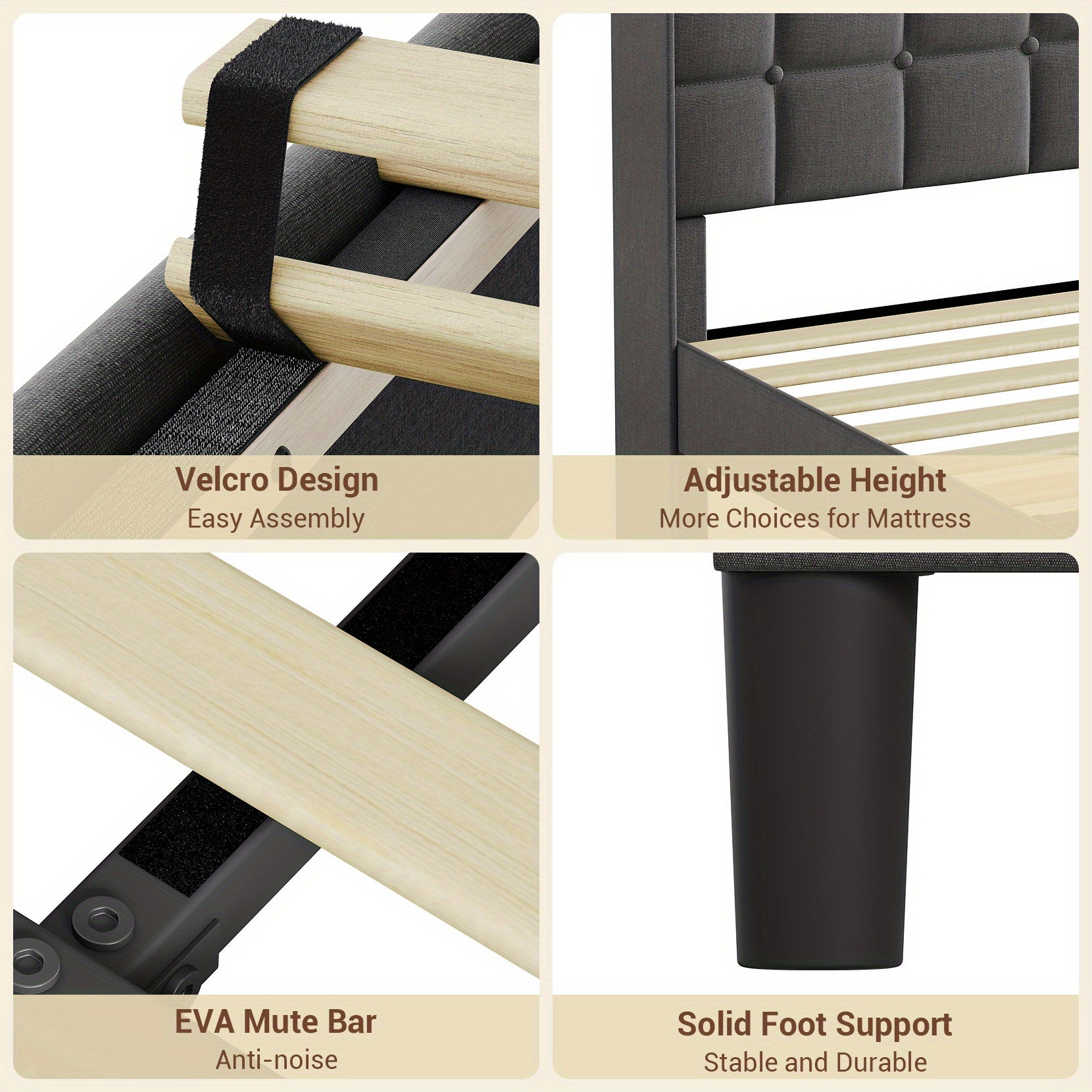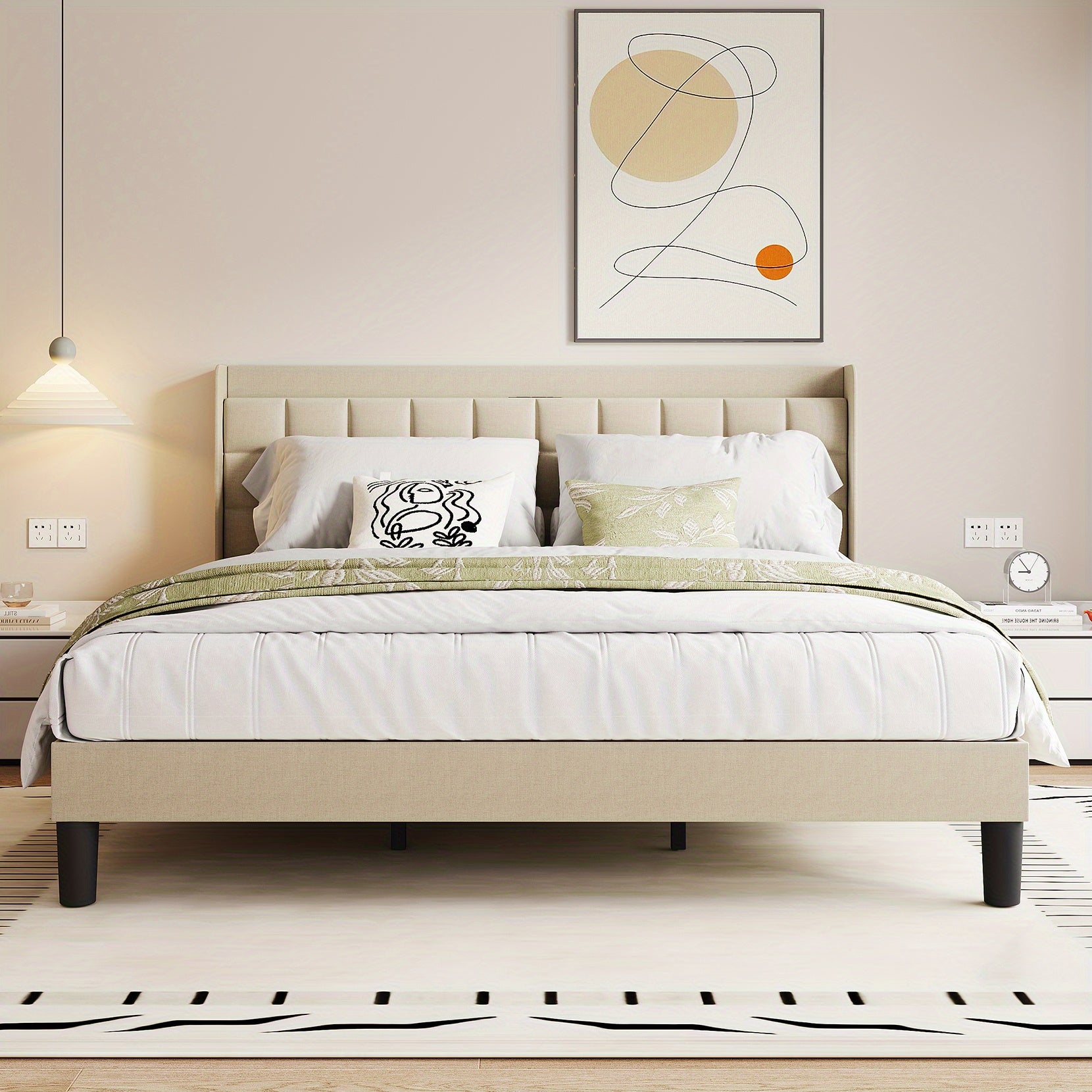This modern linen-upholstered platform bed frame combines breathable linen fabric with high-density foam padding for superior comfort and support. Its sturdy wooden structure, supported by eight solid legs and twelve durable slats, ensures stability and can hold up to 800 pounds. The adjustable headboard offers three height settings to accommodate mattress thicknesses between 8 and 14 inches, perfect for reading, watching TV, or relaxing. Designed for easy assembly and contemporary small-space living, this bed frame requires no box spring, blending practicality with sleek, durable craftsmanship.