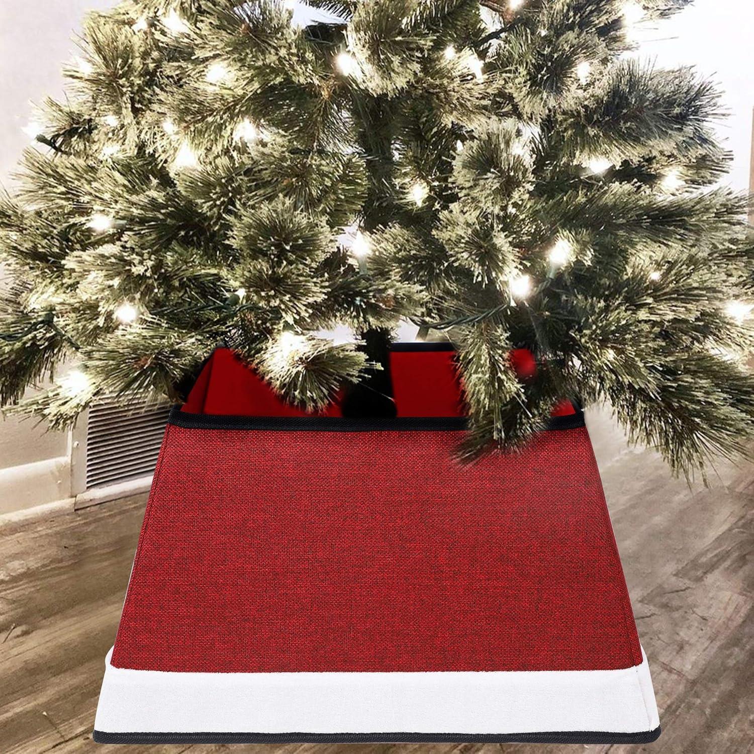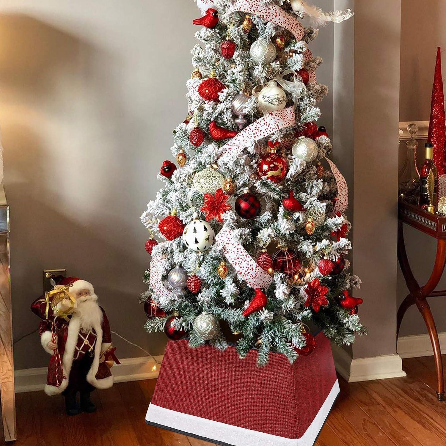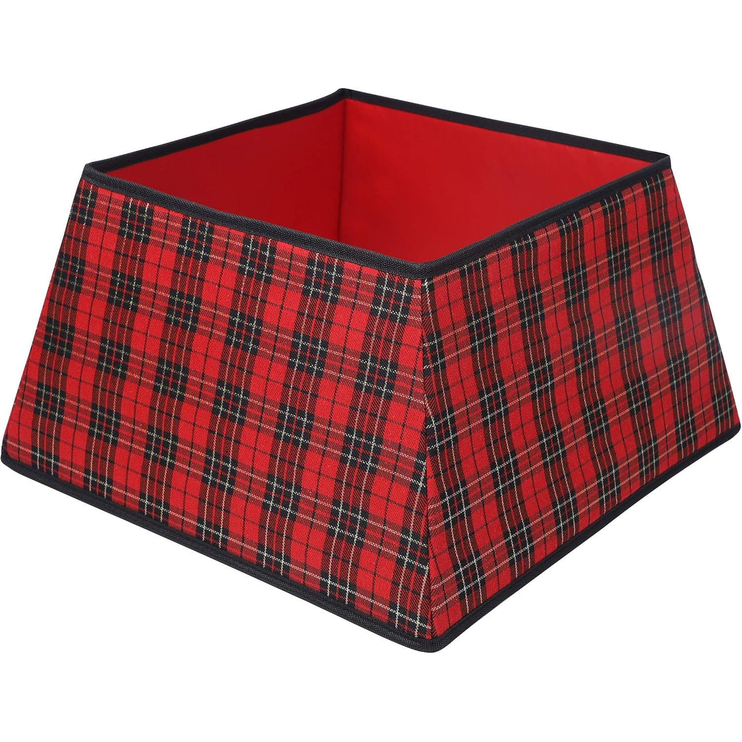 Elevate your holiday decor with this elegant square Christmas tree skirt stand base. Showcasing a natural folding collar basket design alongside charming options of a snow trim or classic plaid pattern or black belt detailing, it brings warmth and festive spirit to any living room.