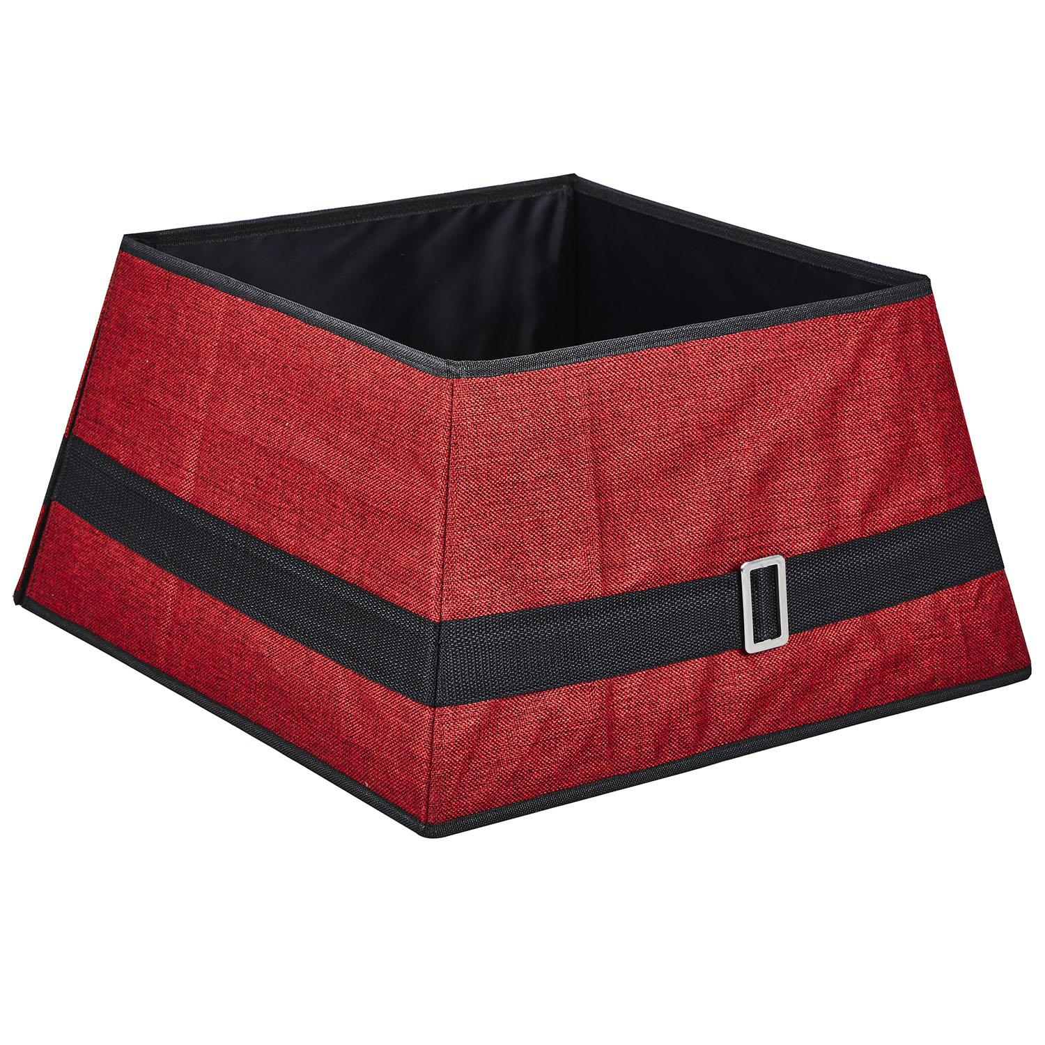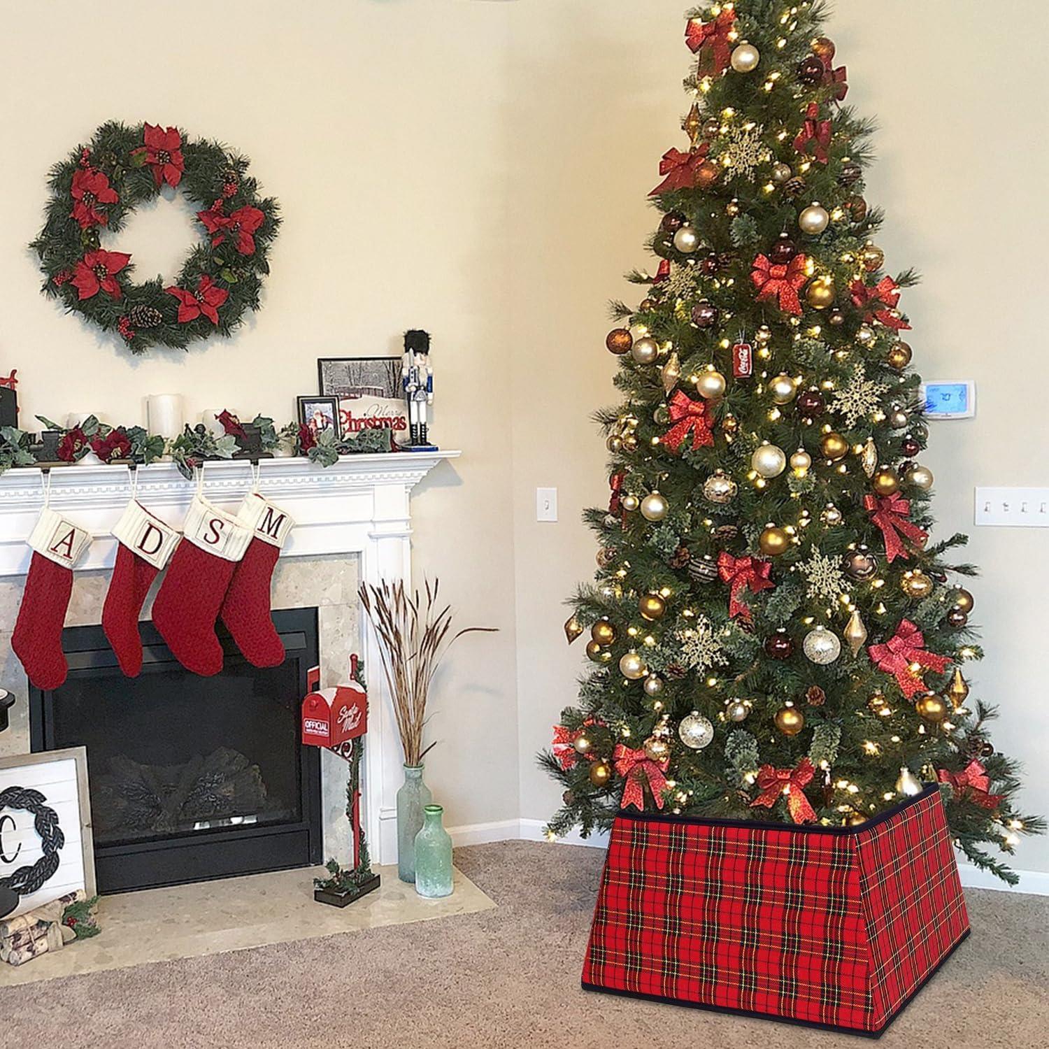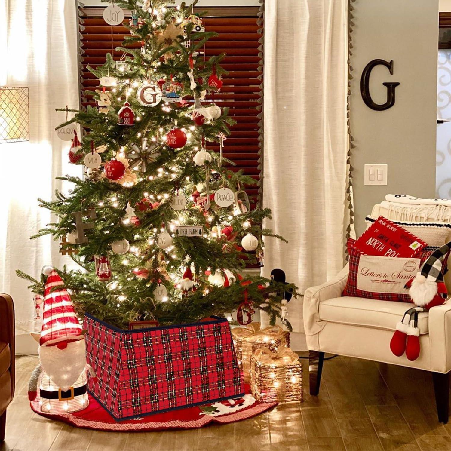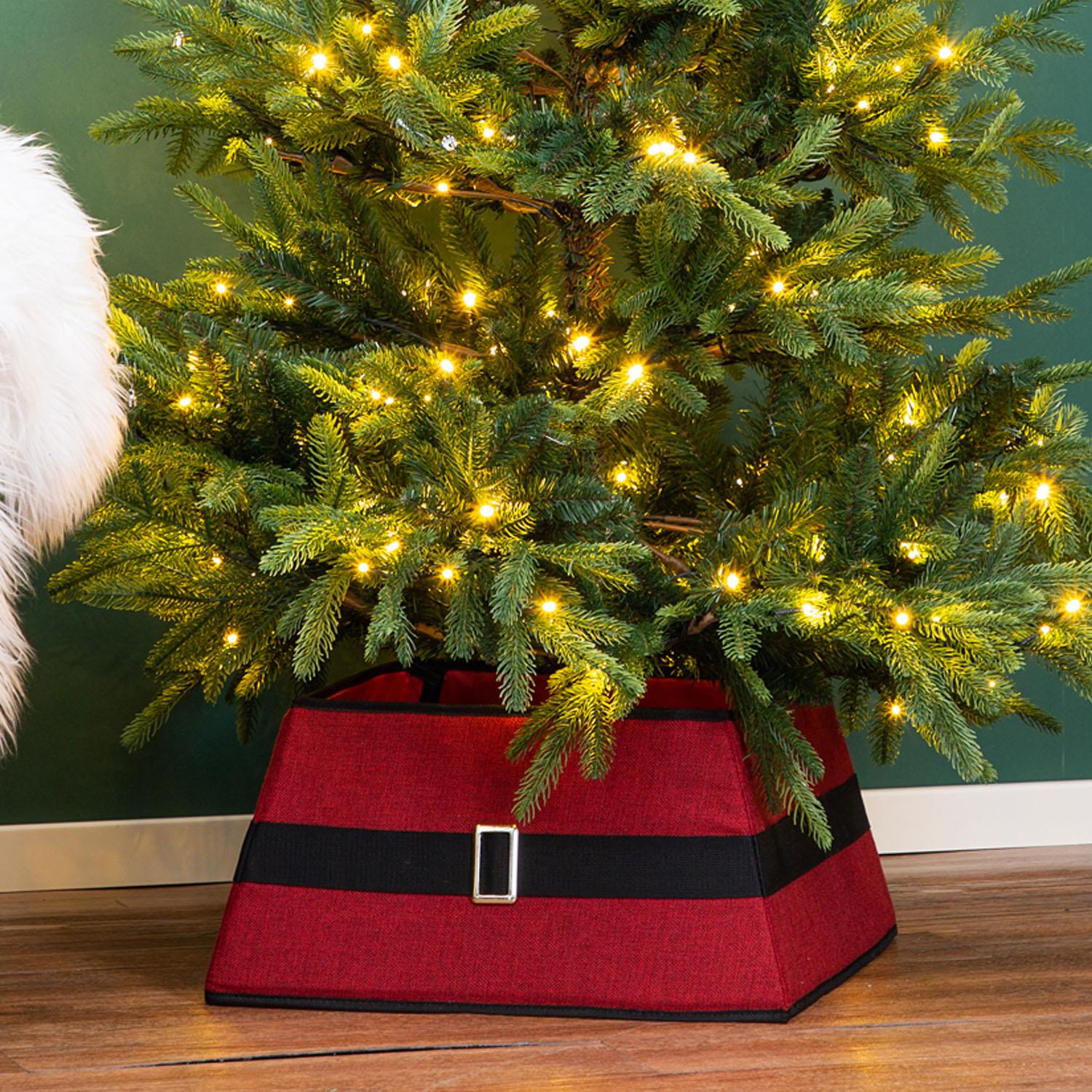 Elevate your holiday decor with this elegant square Christmas tree skirt stand base. Showcasing a natural folding collar basket design alongside charming options of a snow trim or classic plaid pattern or black belt detailing, it brings warmth and festive spirit to any living room.