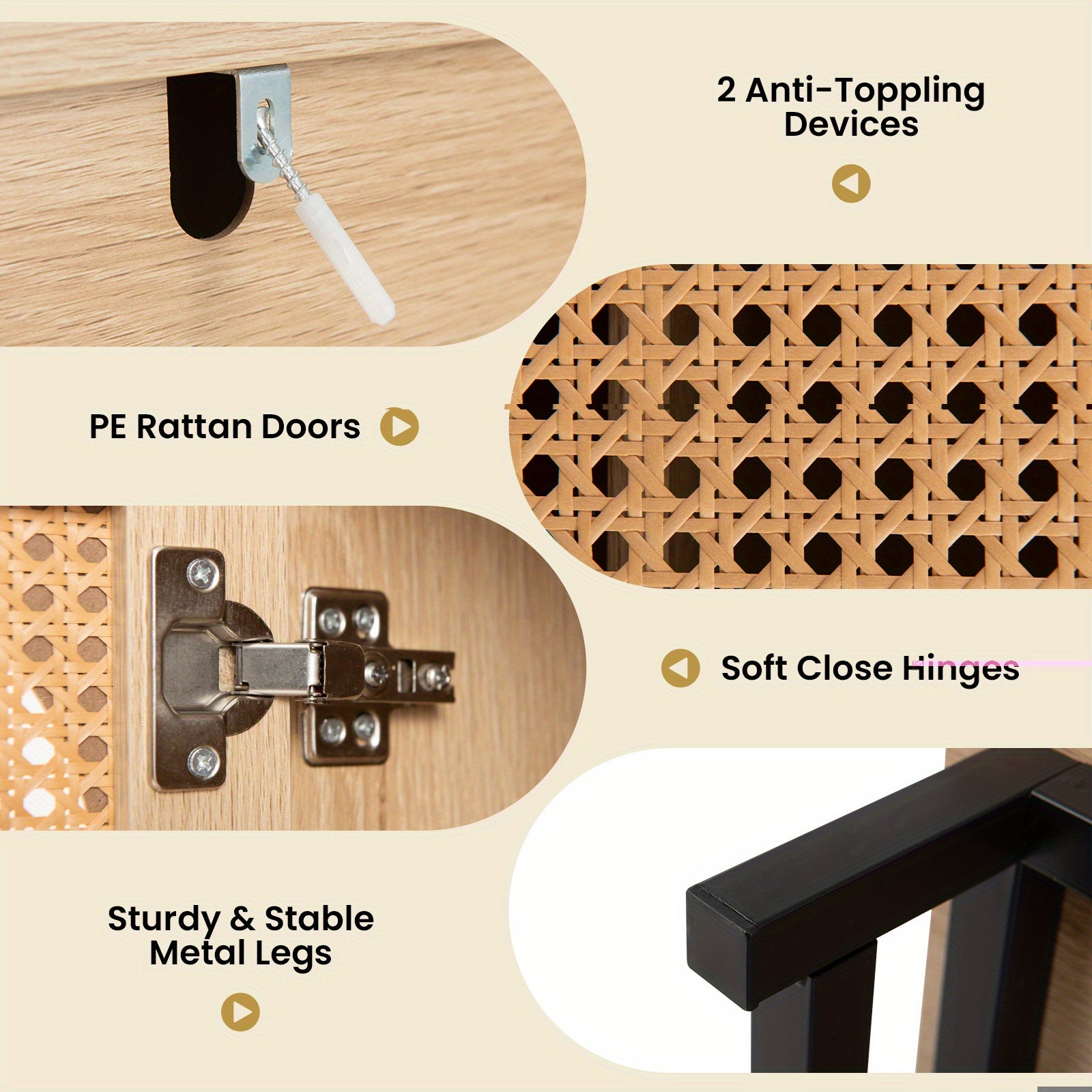 Introduce farmhouse elegance to your dining or living room with this refined sideboard featuring four PE rattan doors. Built from durable MDF and pine wood, it provides adjustable shelving for flexible storage options. The natural beige wood finish paired with black metal legs offers a sleek design that complements a range of interiors. Intended for floor mounting, this cabinet is equipped with tip safety protection and supports up to 49.9 kg, delivering both style and durability. Dimensions: 126 x 40 x 81 cm (L x W x H).