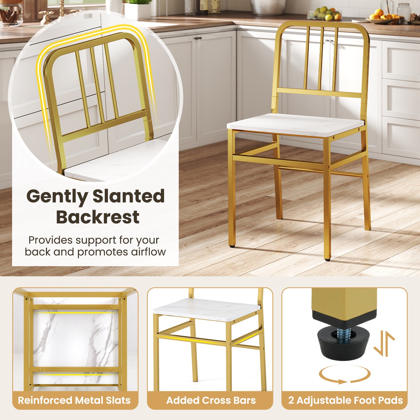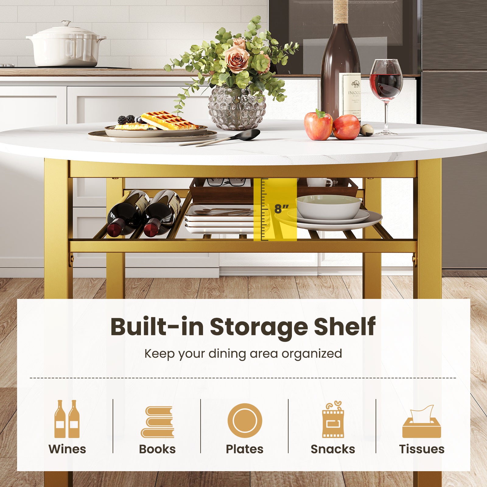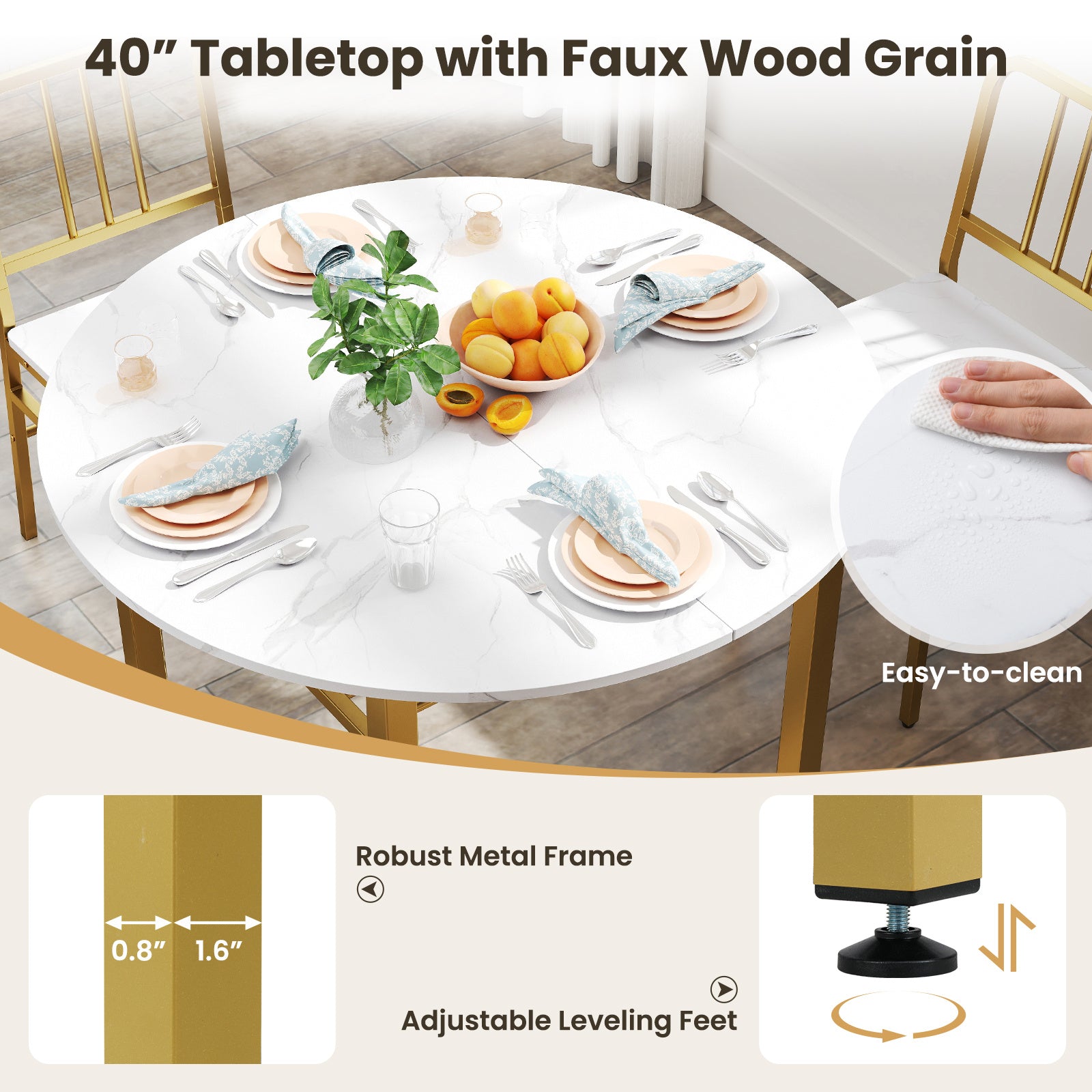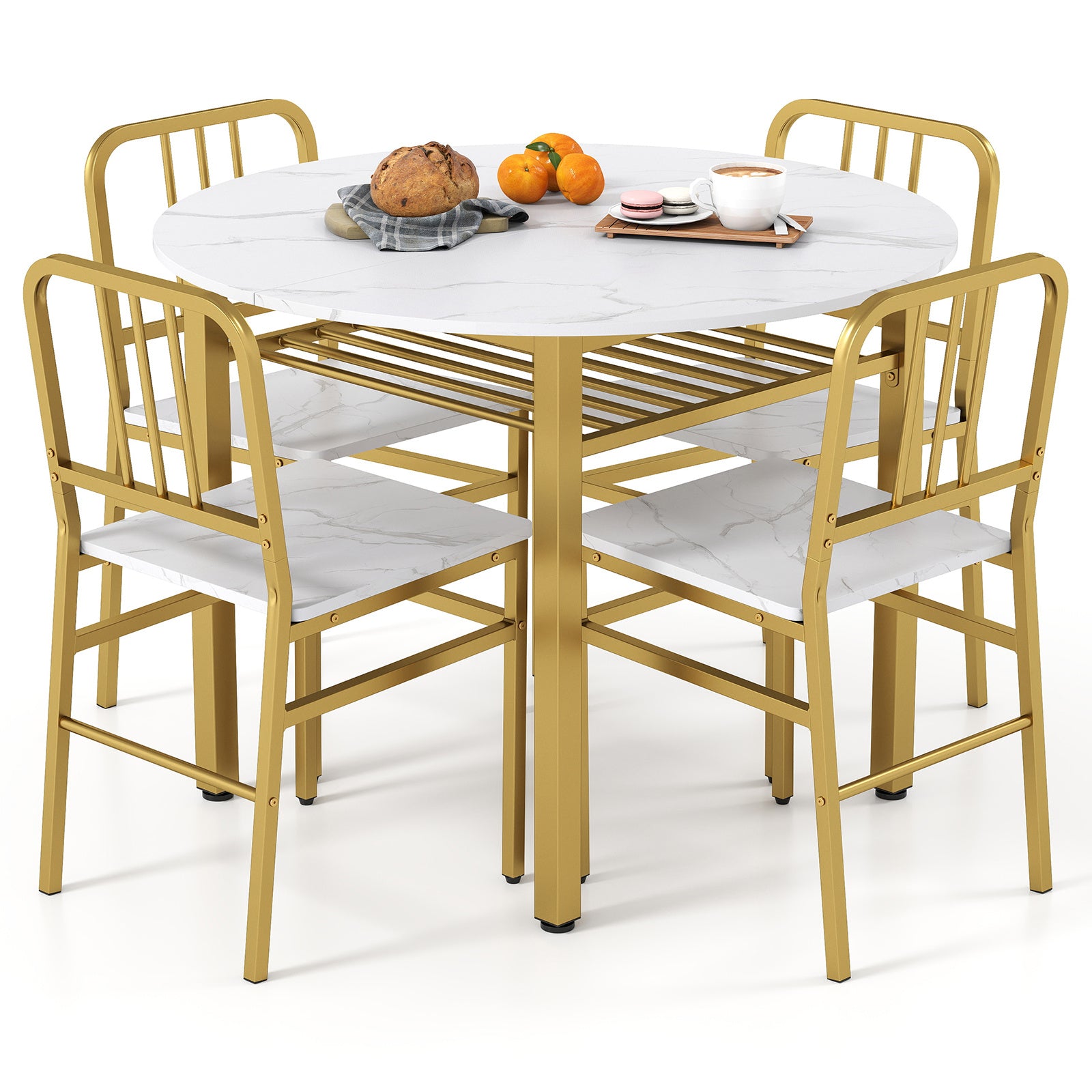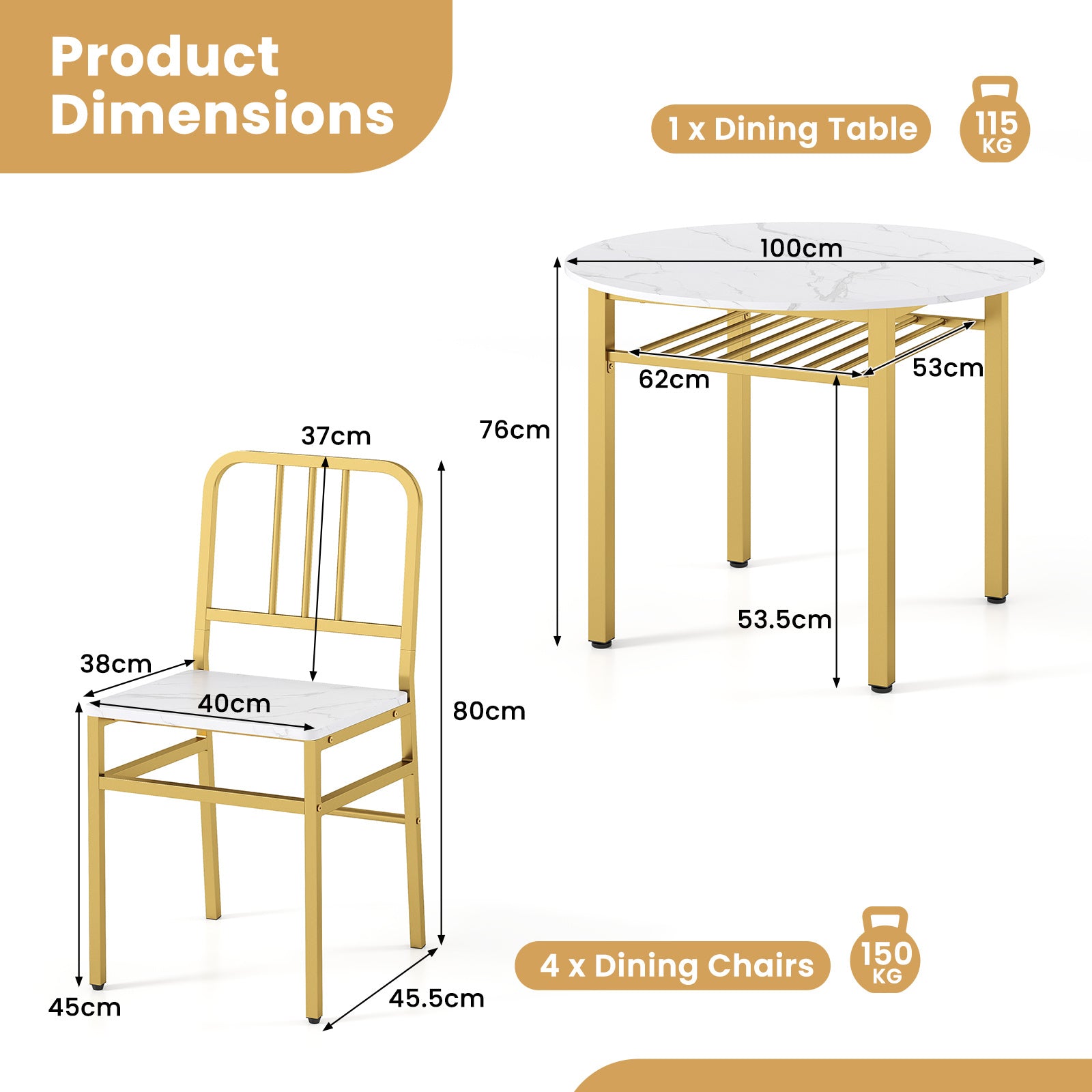 This comprehensive 5-piece dining collection delivers practical elegance for modern living spaces. The round table, measuring 40 inches in diameter, pairs seamlessly with four streamlined armless chairs that tuck neatly away when not in use—ideal for apartments and compact kitchens. Engineered wood with a marble-inspired finish provides a sophisticated aesthetic, whilst the powder-coated metal frame ensures exceptional durability and stability. The integrated storage shelf maximises functionality without compromising style. Weighing 72.75 lbs and constructed from premium materials, this dining set combines space-conscious design with robust engineering, making it an intelligent investment for those seeking versatility without sacrificing quality or visual appeal.