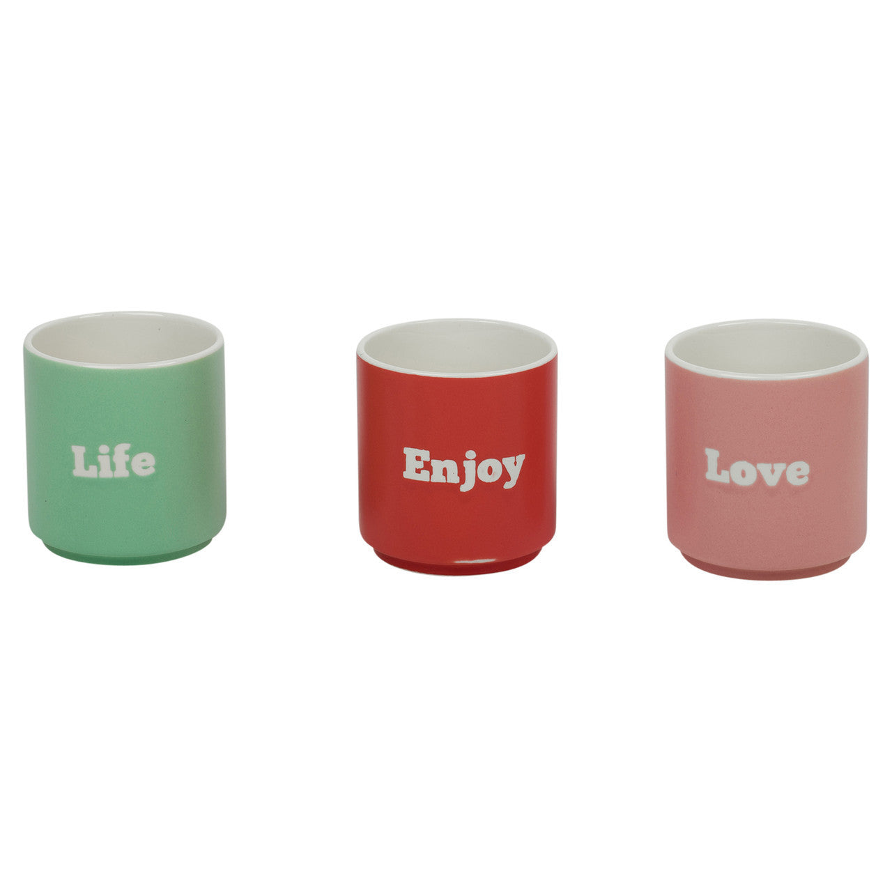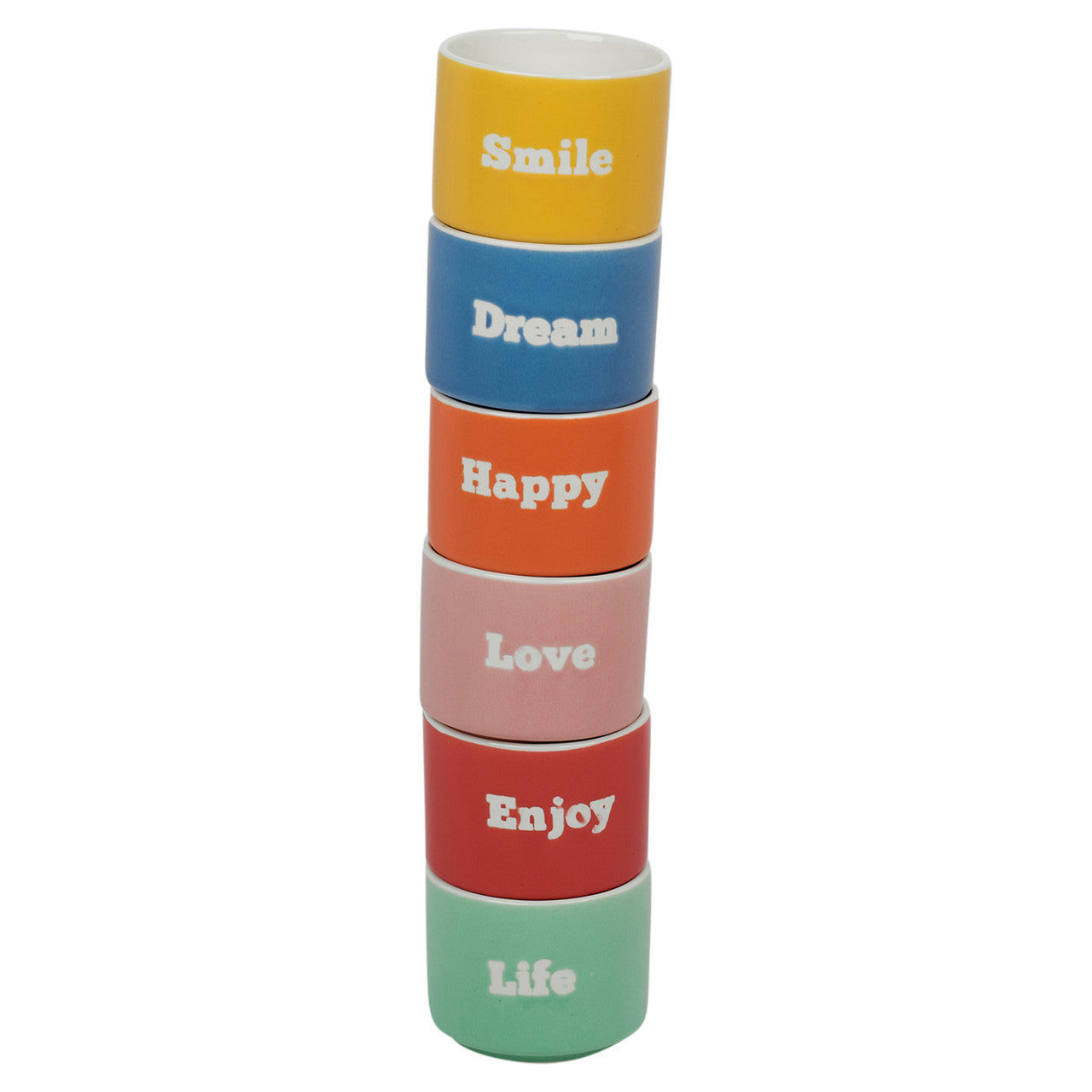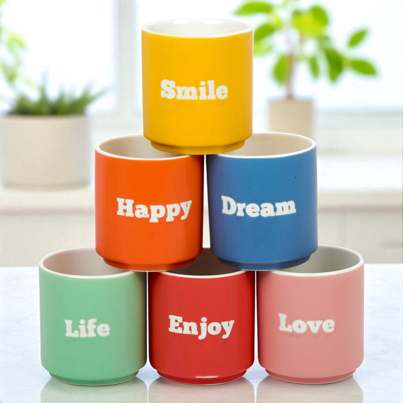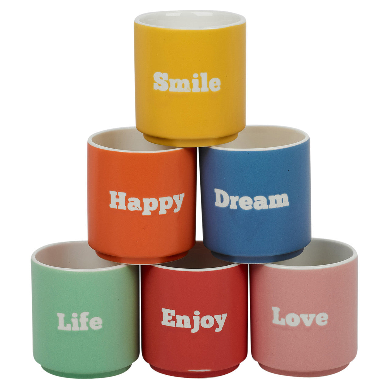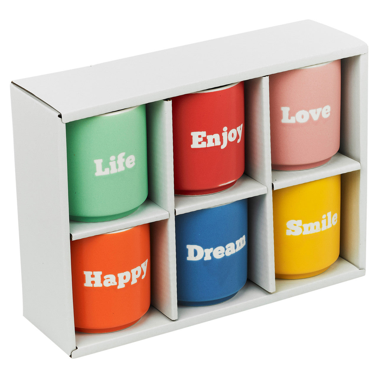 Enhance your coffee experience with this beautiful set of six 180ml porcelain espresso mugs, each presented in a vibrant colour and featuring an inspiring word like "Life," "Enjoy," "Happy," or "Dream." Perfectly sized at 8cm high and 7cm in diameter, they accommodate a small coffee or a robust espresso with ease. Made from durable New Bone Porcelain, these mugs combine elegance with resilience, suitable for daily use. Their versatile design ensures safe use in dishwashers, microwaves, and ovens, offering convenience without compromising quality. Delivered in a stylish gift box with a transparent lid, this set is an ideal choice for gifting or enhancing your own coffee ritual.