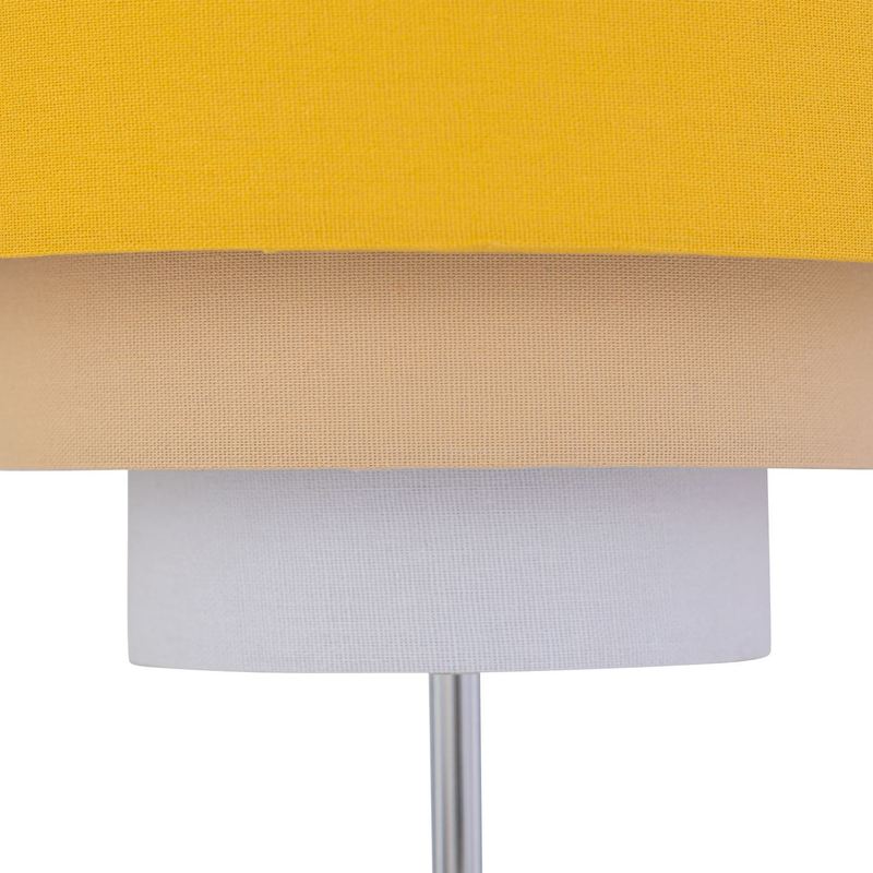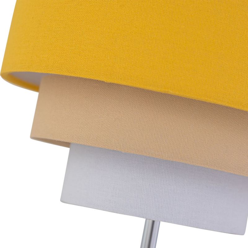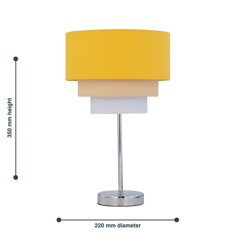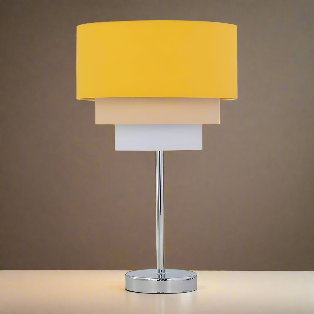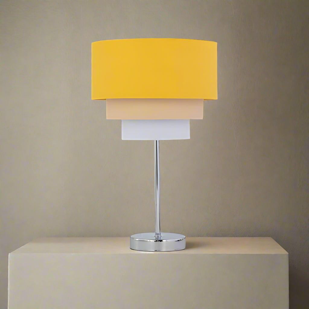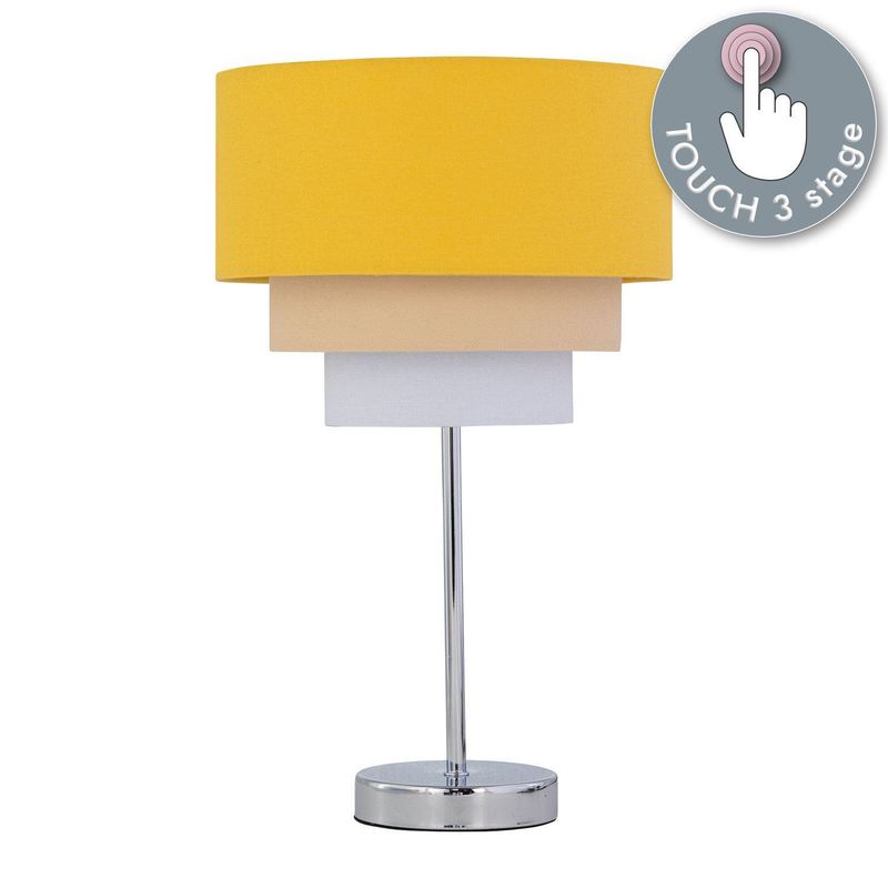 This modern table lamp showcases a brushed chrome metal base with a three-tiered ochre linen drum shade, featuring a subtle floral theme in a solid color pattern. Designed for versatile use across various rooms, it operates via a touch-sensitive rocker switch and is plug-powered with a British specification plug, supporting an operating voltage range of 110V to 240V. Crafted in the United Kingdom, it offers an elegant and functional lighting solution ideal for home decor.
