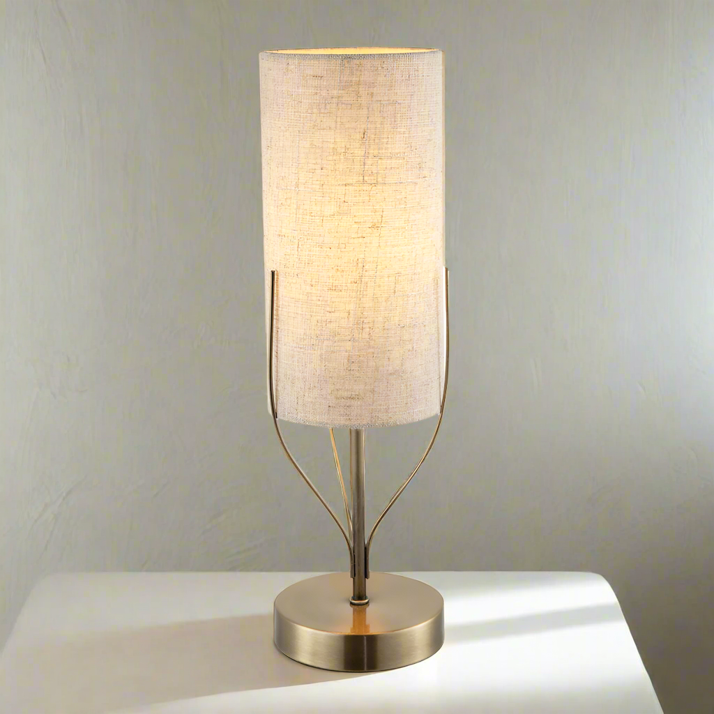 This traditional antique brass metal table lamp features a distinctive design with three supports holding the inner shade. It is complemented by a tall cylindrical linen shade in natural oatmeal, which softly diffuses light to create a warm atmosphere. Measuring 40cm in height and 12cm in both width and depth, the lamp requires one 7-watt SES (E14) bulb, sold separately. It includes an inline on/off switch on a clear cable and is designed with a British specification plug operating between 220V and 240V. Crafted from metal, it combines classic style with practical functionality.