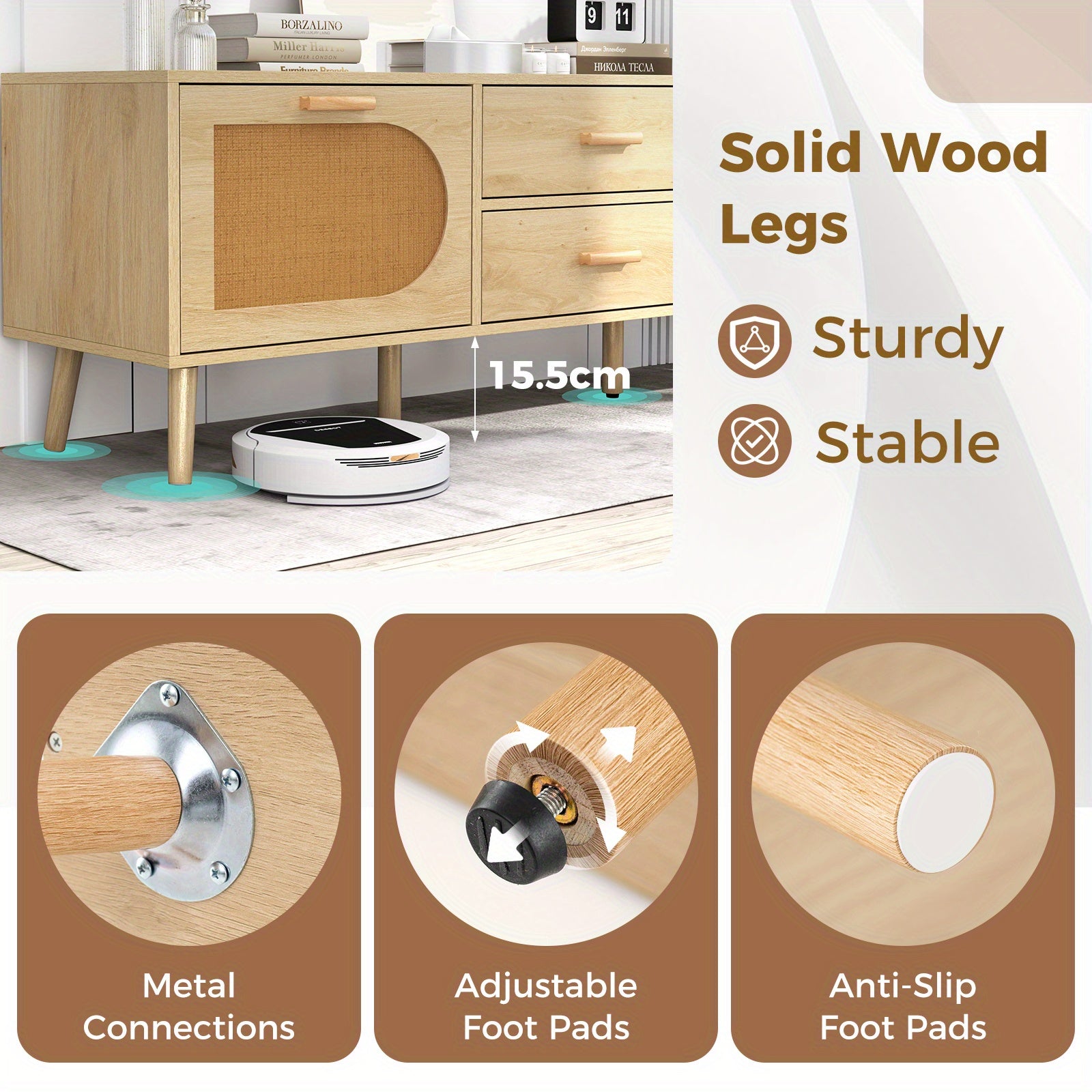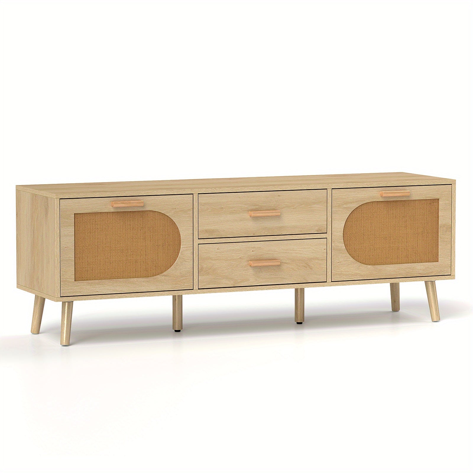This rattan TV stand, designed to accommodate TVs up to 65 inches, combines boho-inspired aesthetics with practical functionality. Its spacious top surface fits various TV sizes, including 40", 55", and 65". Equipped with dual drawers and cabinets, it offers ample storage. Solid wood legs ensure stability and durability, while beech wood handles and smooth metal slides provide easy drawer operation. Metal hinges minimize noise for convenient use, and reinforced metal connections enhance the overall structure. Adjustable foot pads allow for leveling on uneven floors. Crafted from solid wood, paper rattan, engineered wood, and MDF, this stand measures 149.86 x 40.64 x 50.8 cm.
