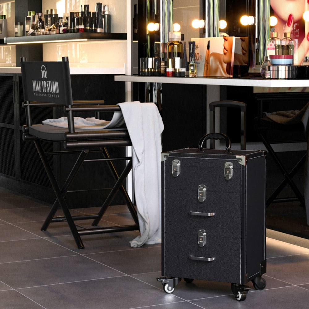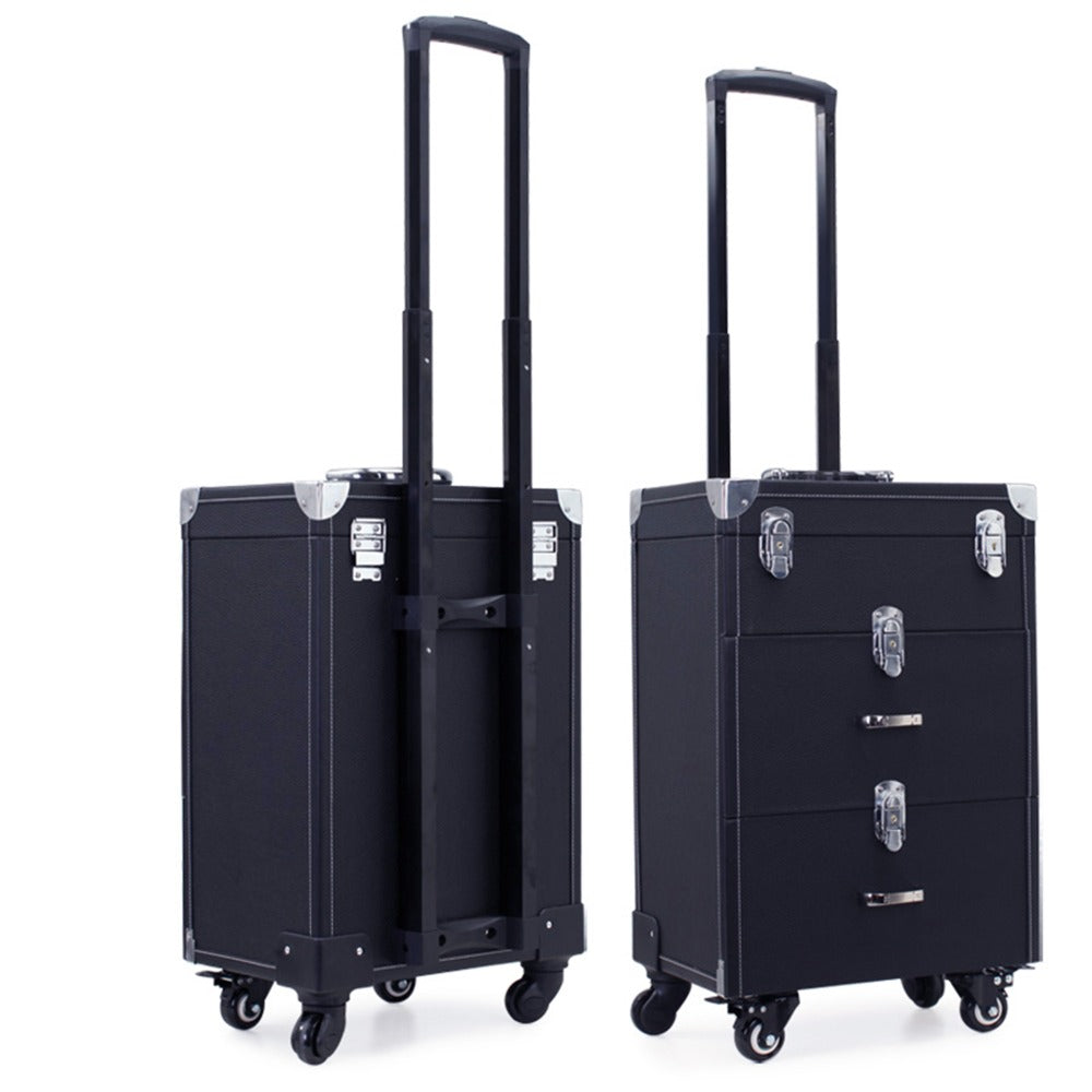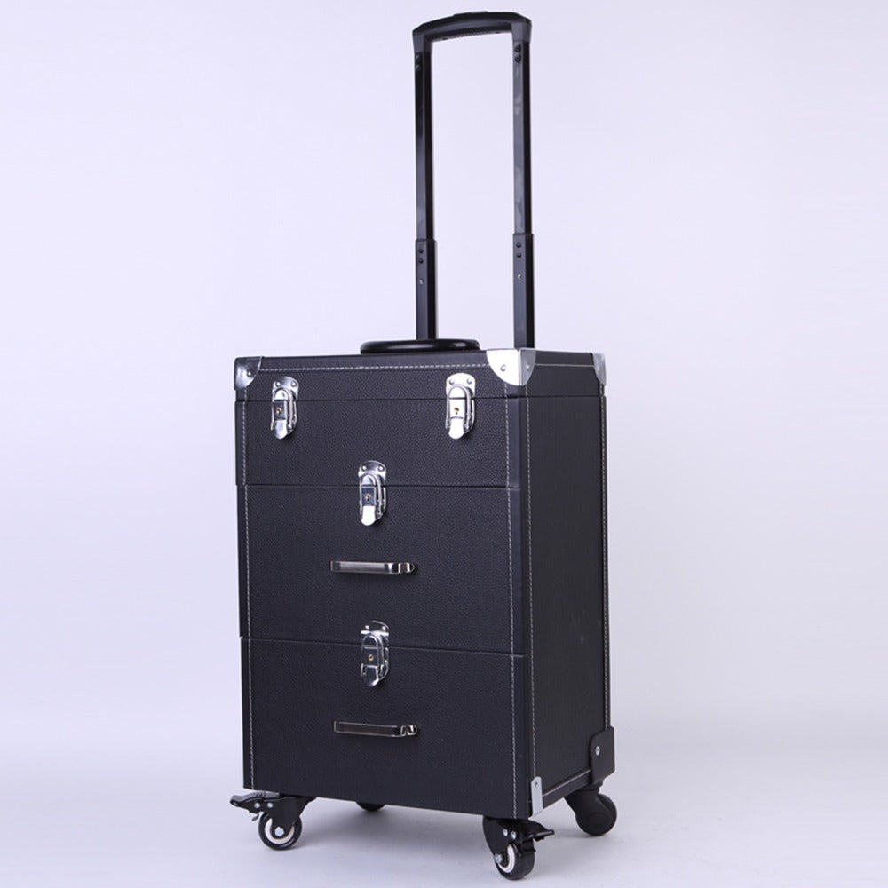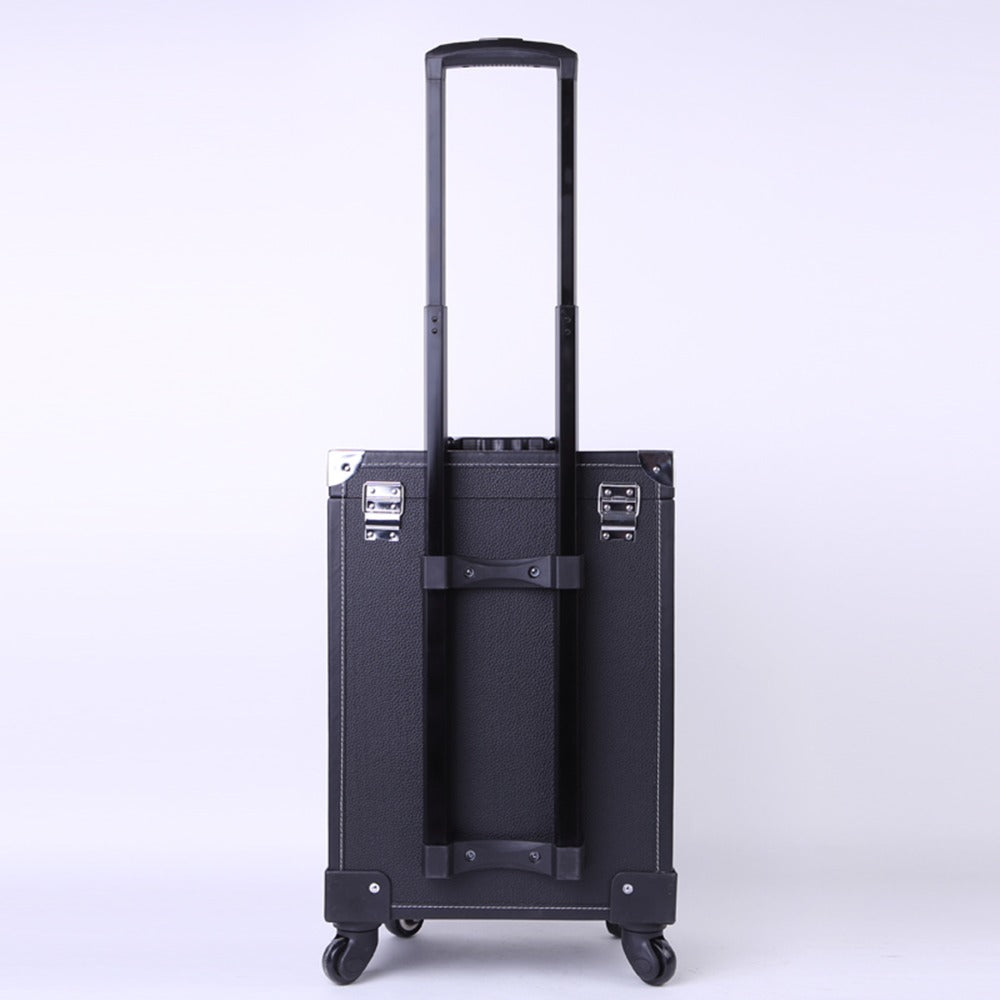 This professional rolling salon trolley features four 360° swivel casters for smooth mobility, supported by a sturdy hexagonal telescopic rod secured with hook and loop fasteners for added stability. The ergonomic ABS handle ensures comfortable handling, while the spacious interior accommodates a wide range of makeup tools. The bottom drawer glides effortlessly for quick access, secured by a buckle to prevent unwanted sliding. Crafted from high-quality leather, the lockable cosmetic case is durable, easy to clean, and ideal for both at-home use and on-the-go professionals such as beauticians and makeup artists.