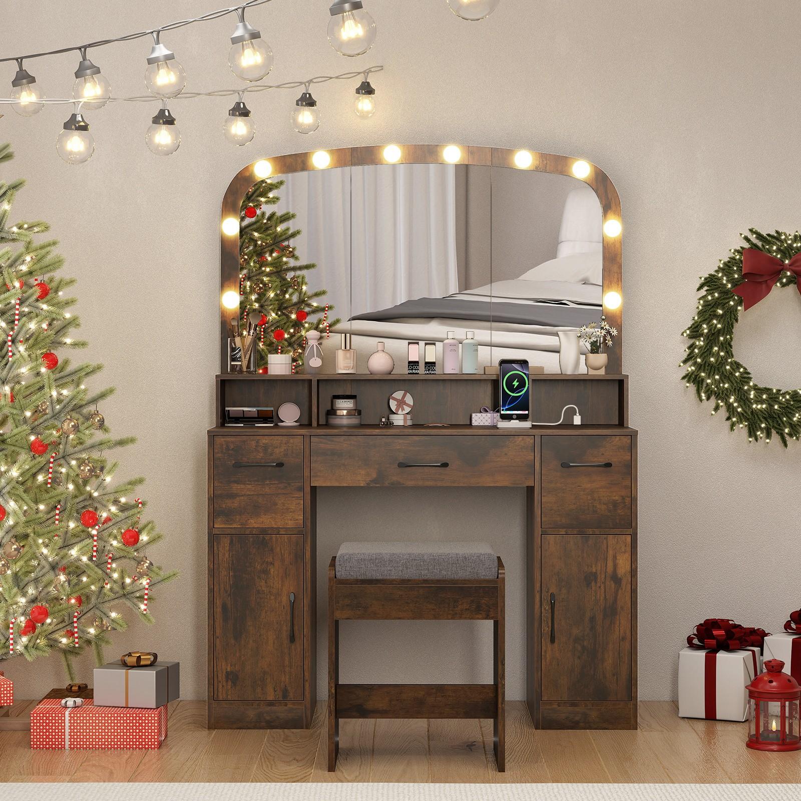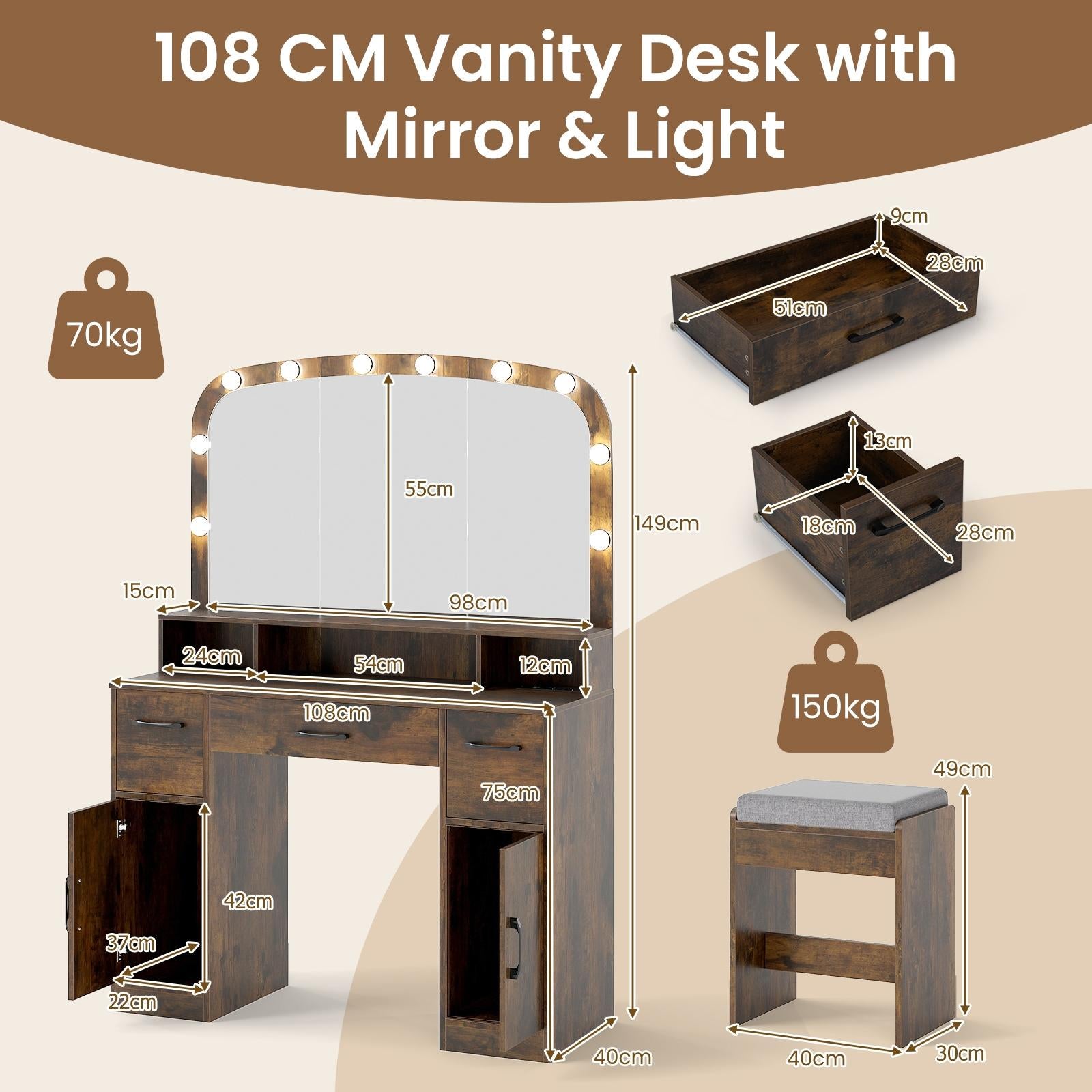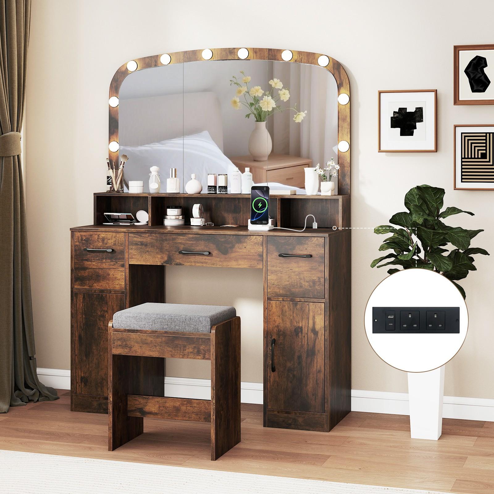 Transform your beauty routine with this sophisticated 108cm vanity desk, meticulously designed to deliver professional-grade results in your personal space. The expansive shatterproof mirror works in concert with ten strategically positioned LED bulbs offering three distinct colour temperatures—3000K for warm ambiance, 4500K for neutral daylight, and 6500K for precision work—ensuring flawless makeup application in any lighting condition. Practical charging ports and integrated cable management systems keep your styling implements accessible and neatly concealed. Built from robust hardwood and particle board, the unit features three generous drawers and two cabinet compartments providing comprehensive storage solutions. A padded matching stool completes the set. Finished in contemporary brown with UK plug compatibility (220V–240V).