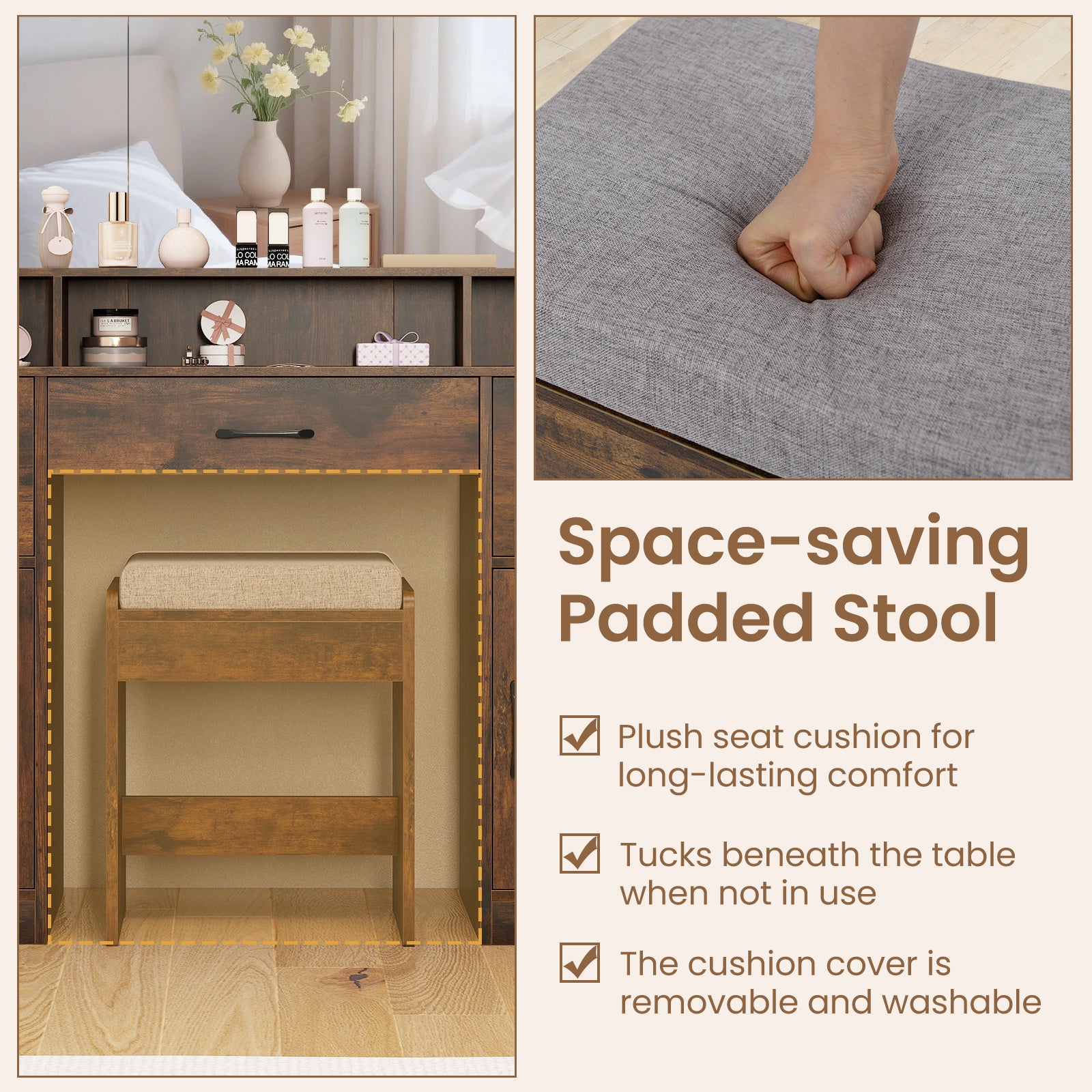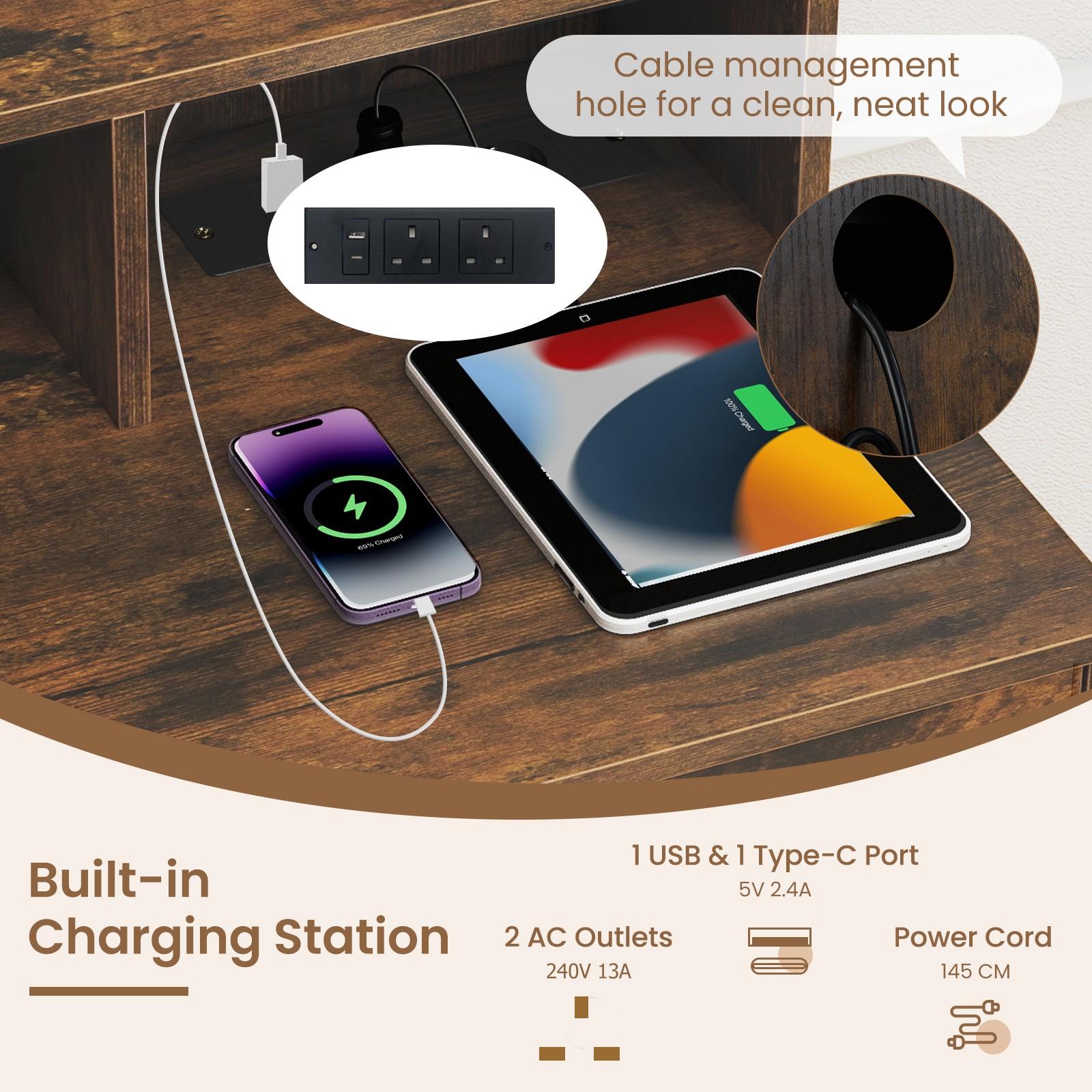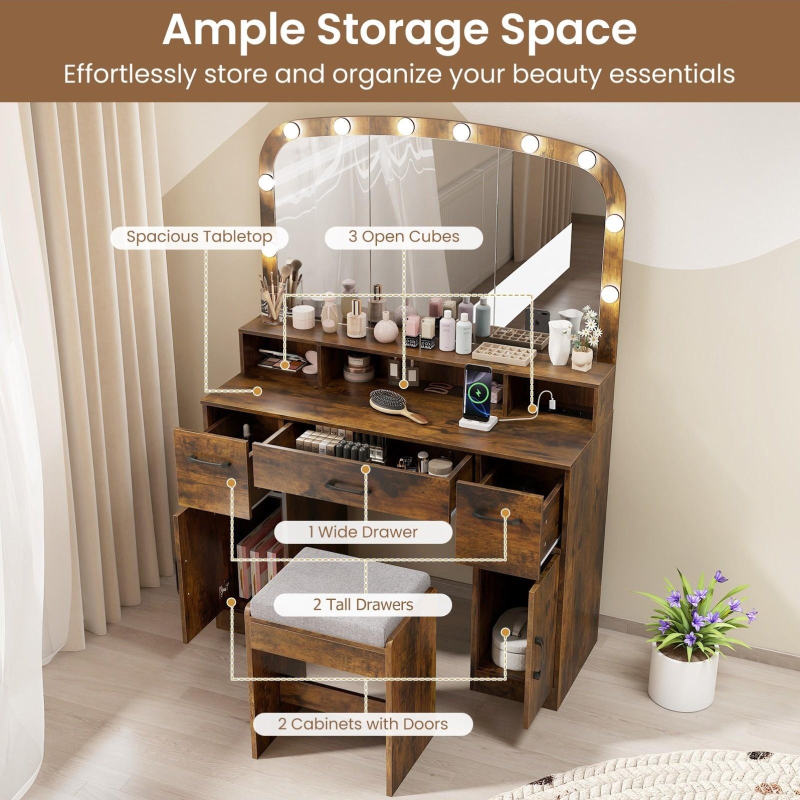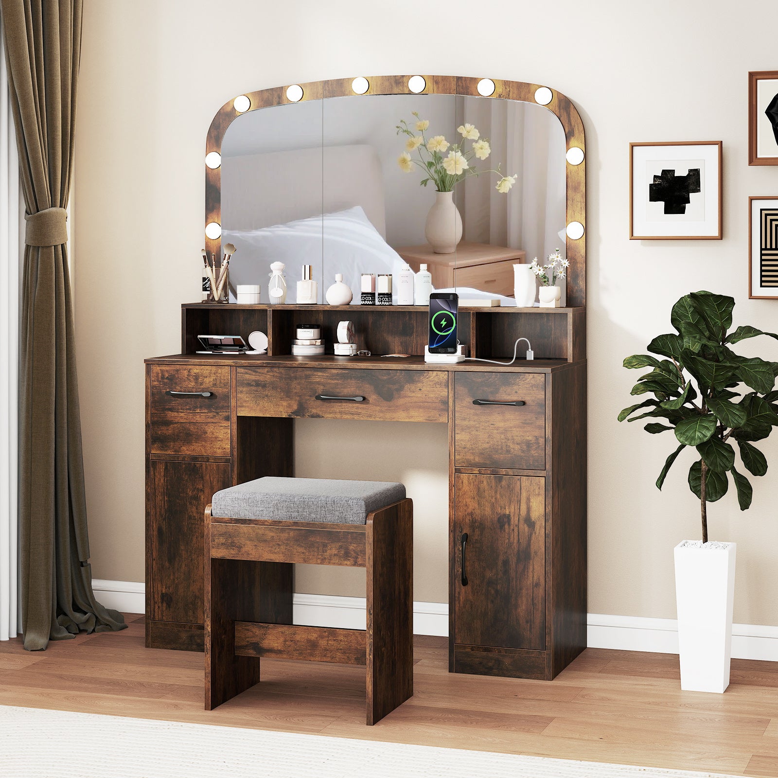 Transform your beauty routine with this sophisticated 108cm vanity desk, meticulously designed to deliver professional-grade results in your personal space. The expansive shatterproof mirror works in concert with ten strategically positioned LED bulbs offering three distinct colour temperatures—3000K for warm ambiance, 4500K for neutral daylight, and 6500K for precision work—ensuring flawless makeup application in any lighting condition. Practical charging ports and integrated cable management systems keep your styling implements accessible and neatly concealed. Built from robust hardwood and particle board, the unit features three generous drawers and two cabinet compartments providing comprehensive storage solutions. A padded matching stool completes the set. Finished in contemporary brown with UK plug compatibility (220V–240V).
