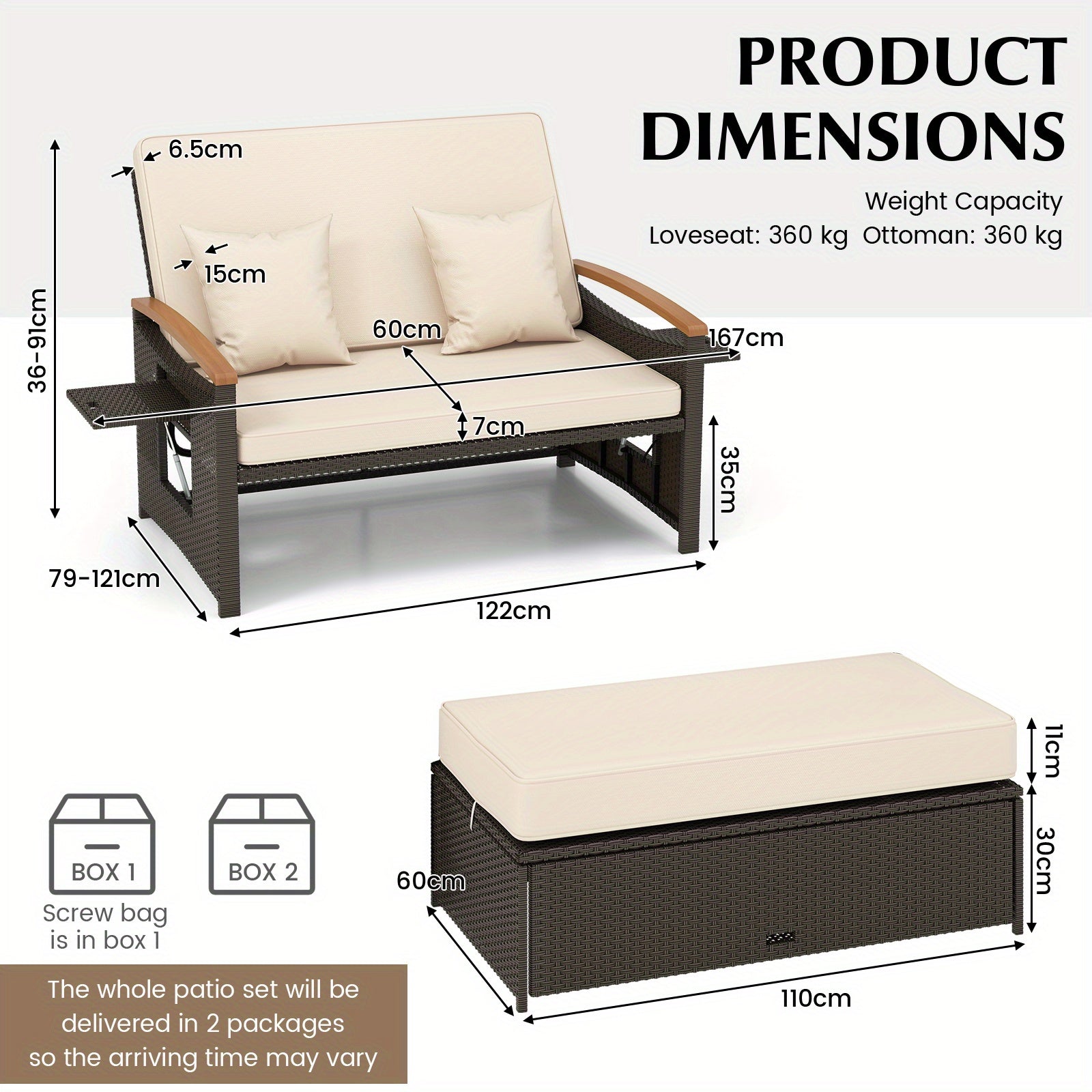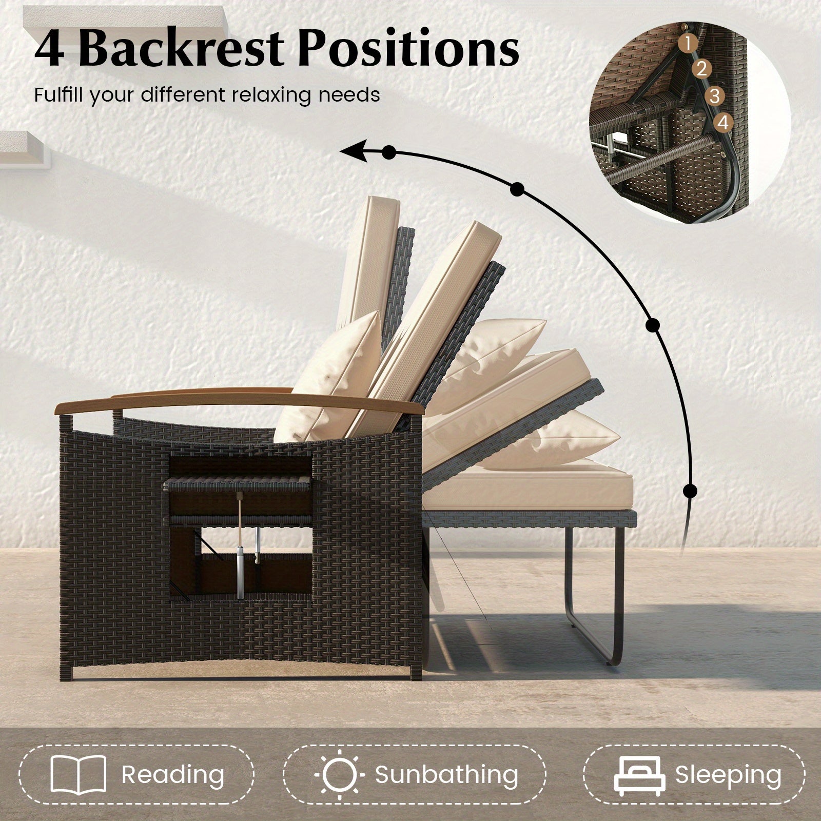 Enhance your outdoor space with this adaptable two-piece set, engineered for superior comfort and versatility. Its innovative design lets you transform the arrangement into a cozy seating area for conversation, a reclining sofa for relaxation, or a sunbed perfect for outdoor naps. The lounge chair features four adjustable backrest positions and weather-resistant cushions with removable covers for easy cleaning. Constructed from durable PE rattan, metal, and acacia wood, it offers concealed storage and a multifunctional bench, ensuring both practicality and lasting performance. Dimensions: 121 x 167 x 91 cm; Weight: 30.5 kg.