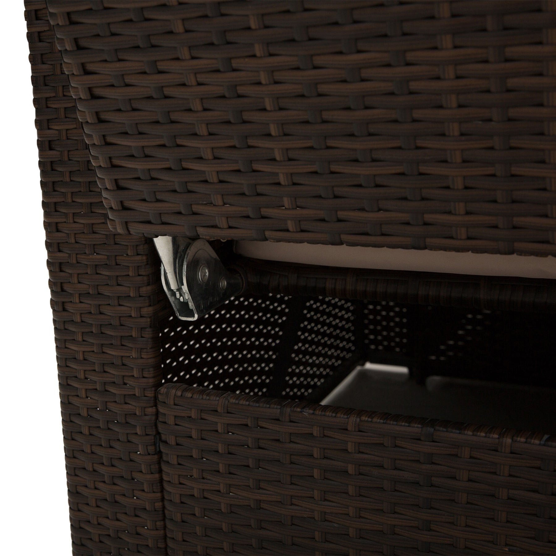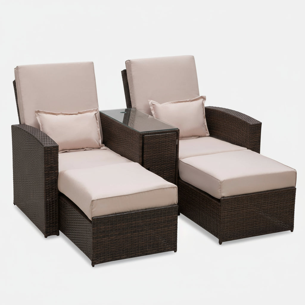 Engineered for year-round outdoor living, this twin lounger combines premium 10mm PE rattan with robust weatherproofing and UV stability to maintain its refined finish. The expansive 195cm × 165cm footprint seats two with generous comfort, supported by 8cm fire-retardant cushions featuring removable, machine-washable covers. A five-position manual recline system offers flexible positioning from fully reclined to upright. The integrated centrepiece table pairs tempered glass with a lockable storage cabinet and umbrella slot, consolidating surface utility and secure storage in one sculptural element. Arriving pre-assembled, it demands only spot-cleaning of the rattan to sustain its aesthetic integrity across seasons. A considered investment for discerning outdoor spaces.