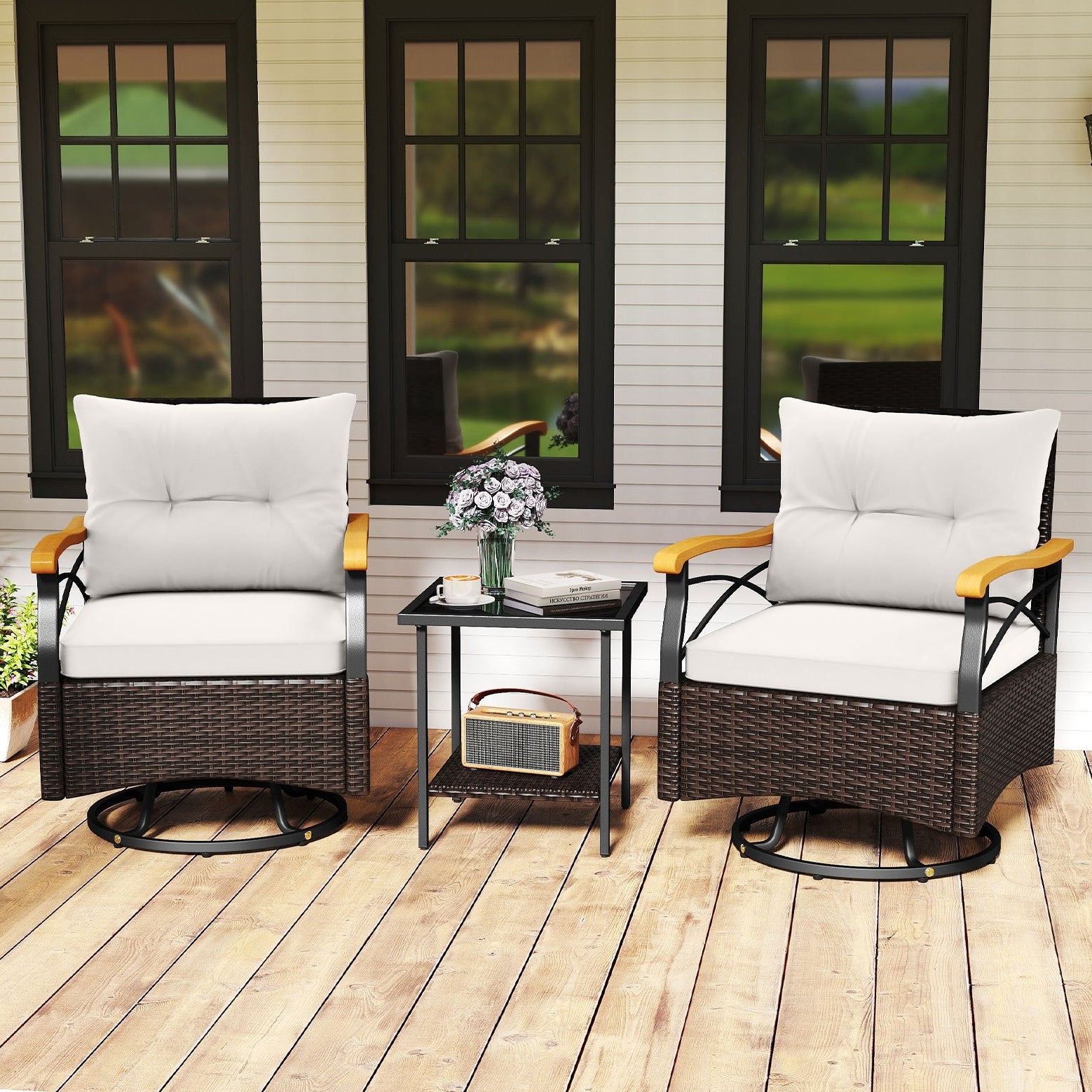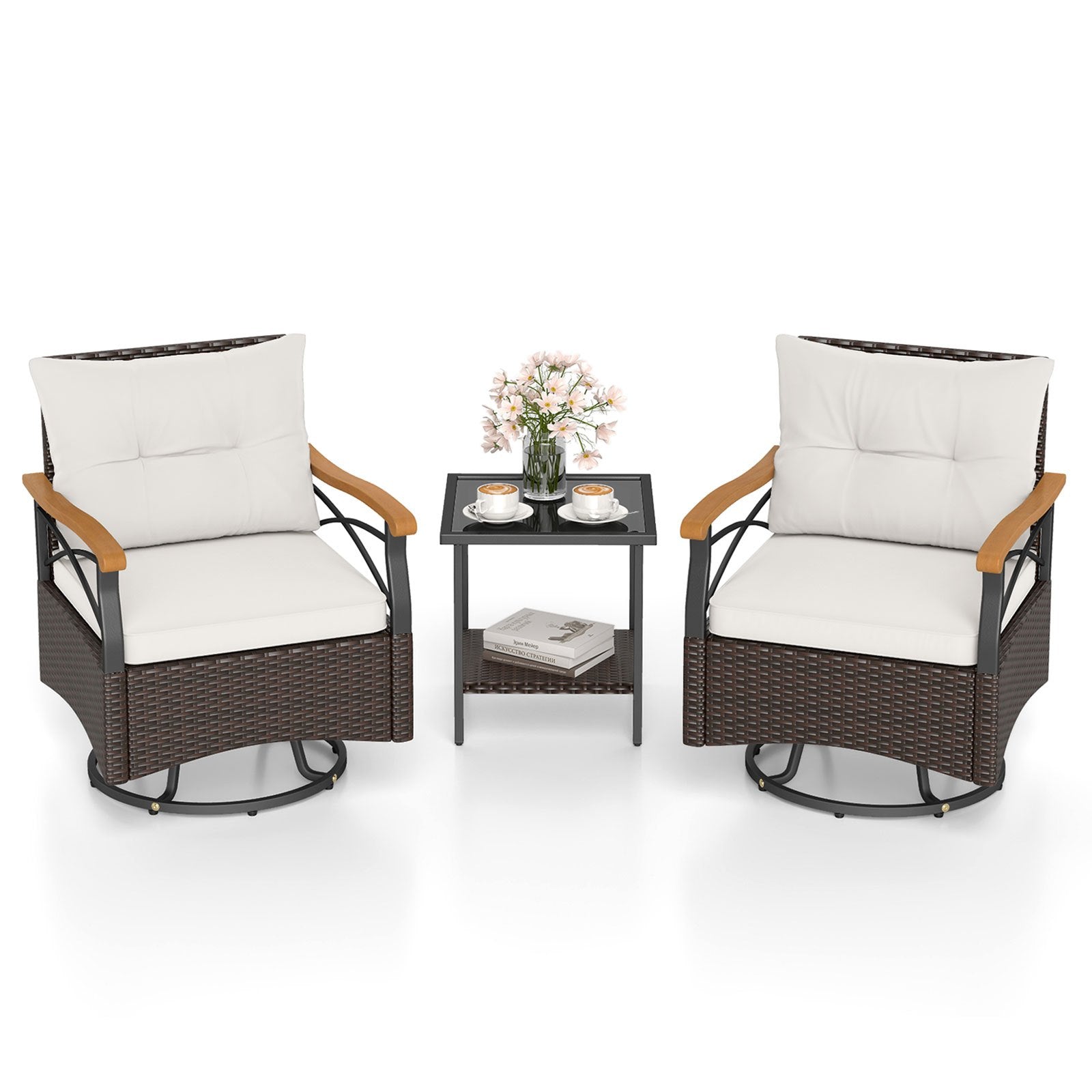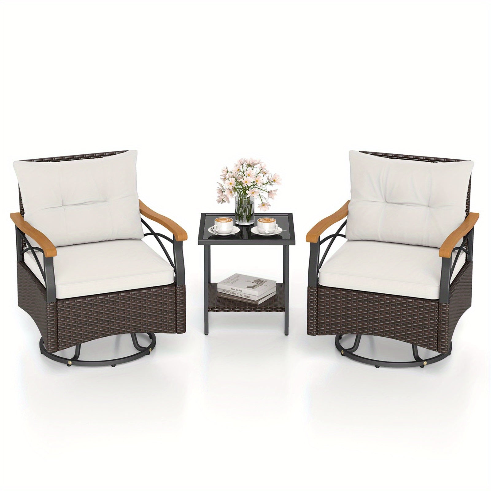 Enjoy effortless outdoor entertaining with this three-piece patio set, featuring two swivel armchairs and a matching side table. Each chair rotates a full 360 degrees, allowing you to pivot toward conversation partners or adjust your position without standing. The durable PE rattan and metal frame construction withstands outdoor elements, while the reinforced base supports up to 180 kg per seat. Cushioned seats provide comfort during extended lounging, and adjustable foot pads ensure stability on uneven surfaces. The coordinating rattan side table offers convenient surface space for beverages or accessories. Finished in crisp white, this weather-resistant set suits gardens, decks, and patios. Assembly is straightforward, making setup quick and hassle-free.