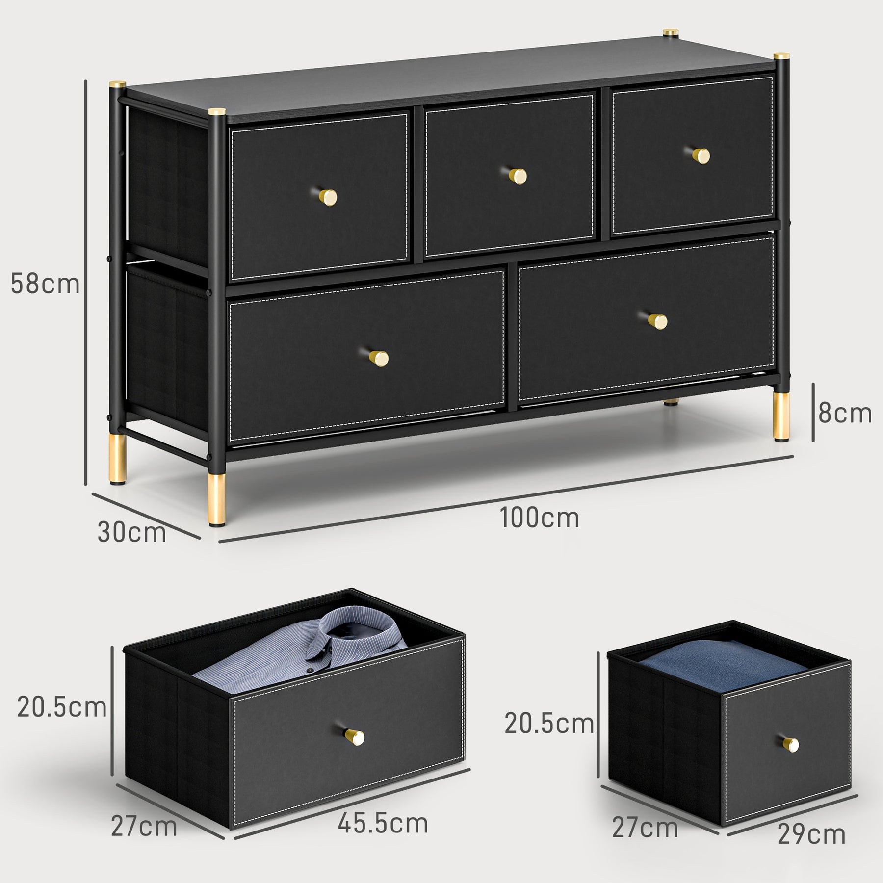 This modern black dresser features five spacious drawers crafted from hardwood and MDF, offering durable and practical storage. Topped with PU leather and supported by a sturdy steel frame, it combines style with strength. Designed as a freestanding piece, it fits seamlessly in bedrooms, living rooms, or hallways. Easy to assemble and floor-mounted, this organizer blends quality materials like wood and fiberboard for long-lasting use in contemporary spaces.