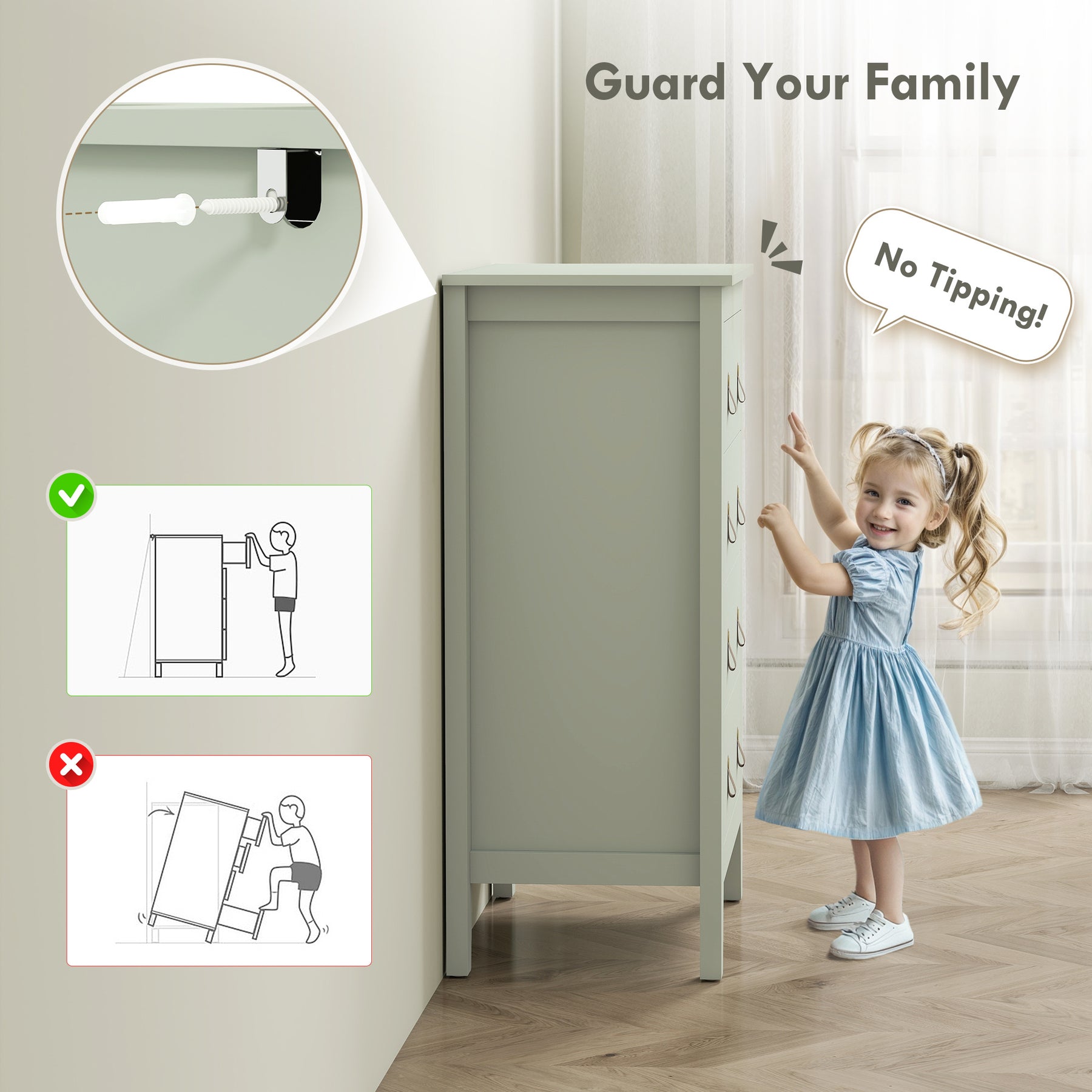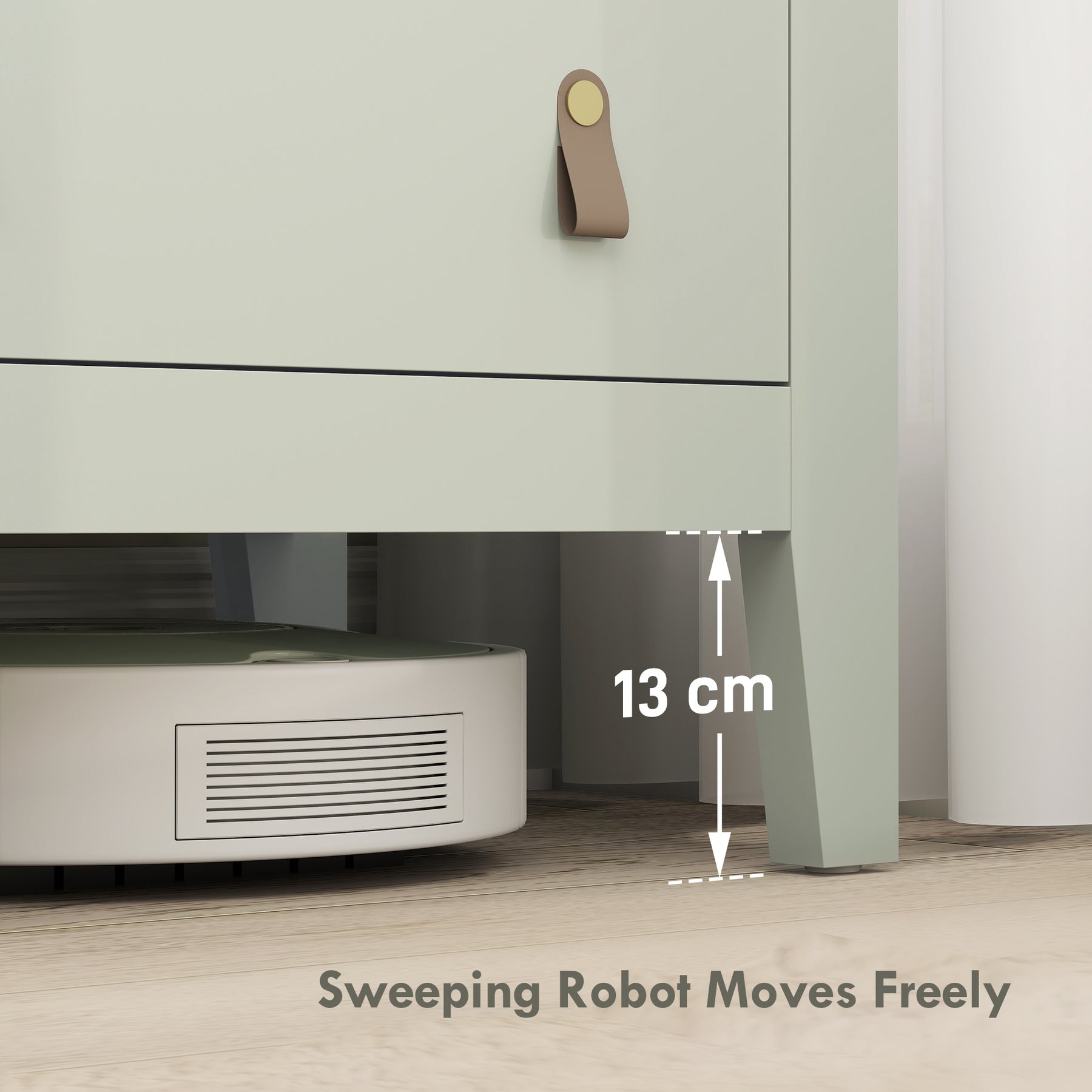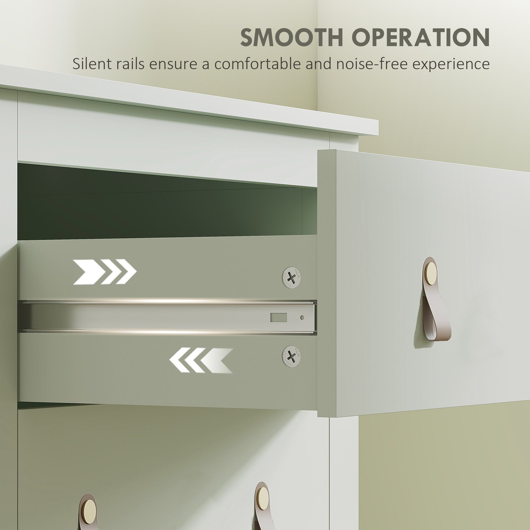 This modern 4-drawer chest combines functionality with style, featuring spacious drawers ideal for organising clothes and accessories, helping you maintain a clutter-free home. Its elegant design includes distinctive PU leather handles and a light green finish that enhances any bedroom, living room, or hallway. Constructed from durable E1 particle board, it promises long-lasting use, while silent metal runners ensure smooth, noise-free drawer operation. Equipped with anti-tip safety devices for secure wall attachment. Dimensions: 98H x 60W x 40D cm, with drawers supporting up to 6 kg each. Assembly required.