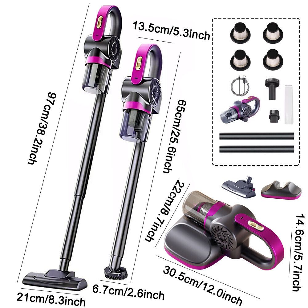 Charge the vacuum for 3-4 hours prior to use and check the battery status. This wet and dry vacuum requires the front lid to be opened to drain liquids before operation. Its USB battery indicator glows red while charging and green when fully charged. Powered by a 120W motor, it offers strong suction on tiles, hardwood, carpets, and pet hair. The 11.1V battery with dual-chip protection delivers 25-30 minutes of runtime after a full 4-hour charge. Weighing only 1.5kg, its cordless, lightweight design enables easy switching to handheld mode for cleaning furniture, stairs, and car interiors. The HEPA filtration system with a three-stage sealed filter captures 99.97% of particles as small as 0.3 microns to improve air quality. Features include a bagless dustbin, washable filters, and a distinctive purple finish. The set includes the vacuum, three brush heads, two filters, a cleaning brush, USB cable, instruction manual, two connecting pipes, and a mite head for versatile cleaning tasks. Package Contents: Vacuum Cleaner x 1 small brush head x 3 Filter x 2 Cleaning Brush x 1 USB Cable x 1 Instruction Manual x 1 Connecting pipe x 2 -Mite head x 1