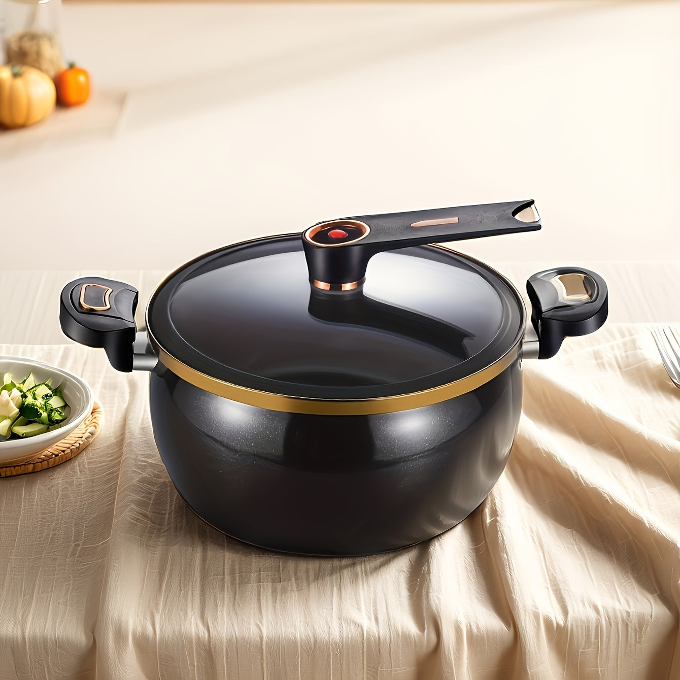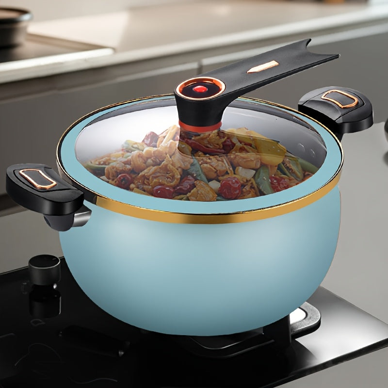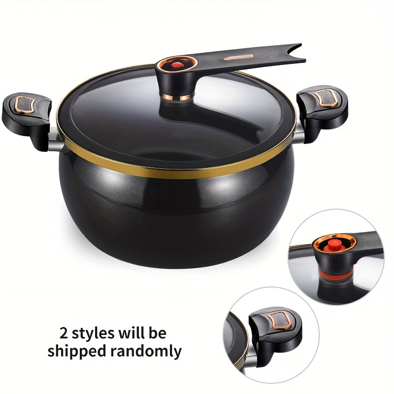 This 8L cast iron stew pot features a locking lid and combines versatility with durability, ideal for preparing soups and stews efficiently. Designed for use on gas stoves, it boasts a sleek black finish with golden accents and includes a glass lid for easy monitoring. Crafted from cast iron, it is dishwasher safe, making it both practical and stylish—a perfect addition to any kitchen or thoughtful home gift.