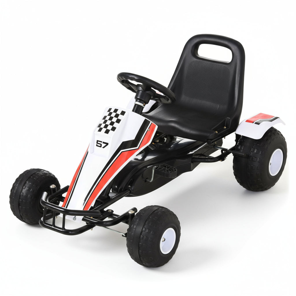 This pedal-powered go kart combines authentic racing aesthetics with practical engineering for young drivers. Constructed from a robust steel frame reinforced with durable plastic components, it delivers stability across four smooth-rolling wheels. The vehicle features a responsive steering mechanism, functional gear shift lever, and hand brake system—all essential controls for developing coordination and motor skills. An adjustable seat accommodates growing children, whilst the spacious tub design ensures secure seating during extended play sessions. Requiring no batteries or charging, this manual-drive model encourages active outdoor play whilst maintaining consistent performance. Suitable for ages three and above, with a maximum load capacity of 35kg. Dimensions: 104L x 66W x 57H cm. Assembly required.