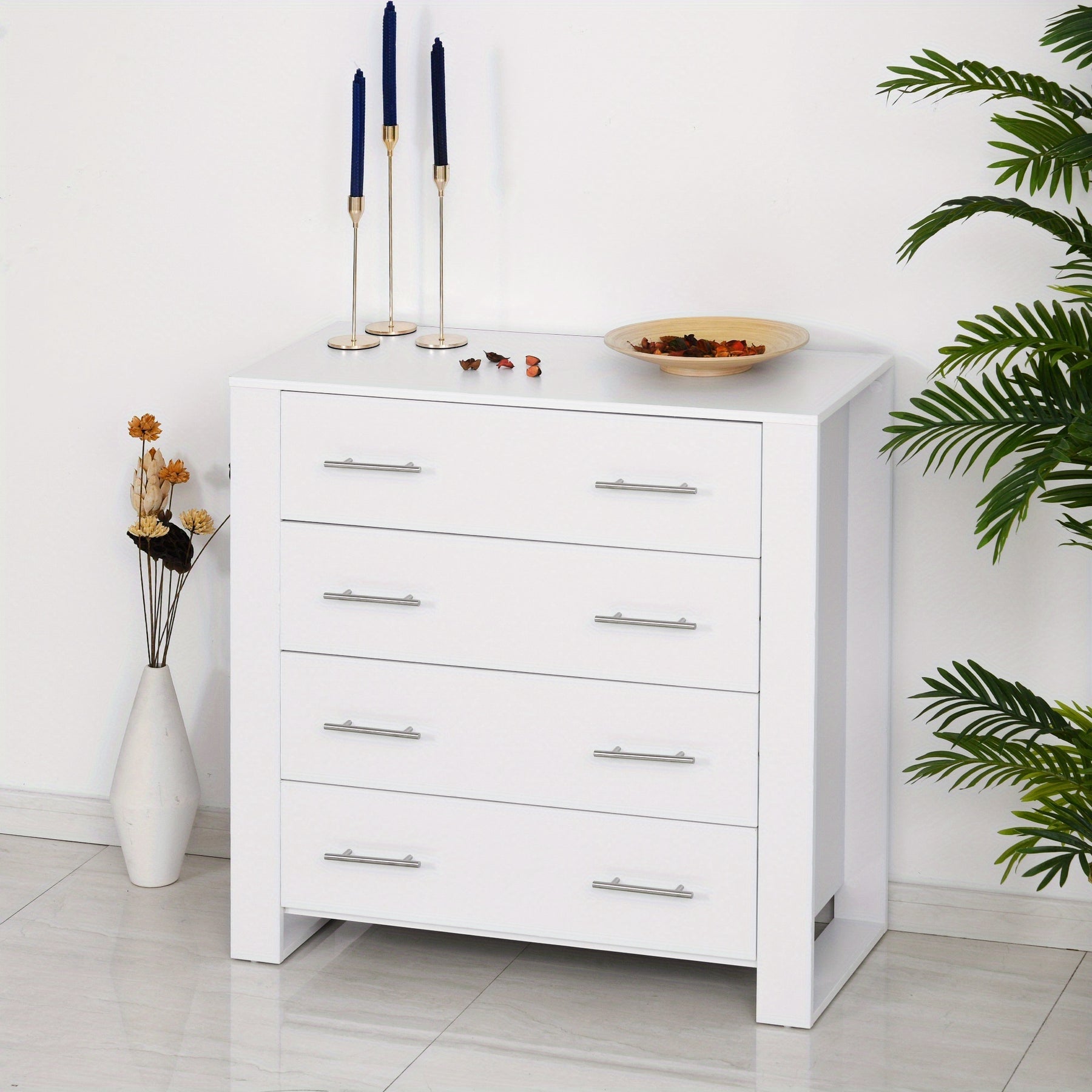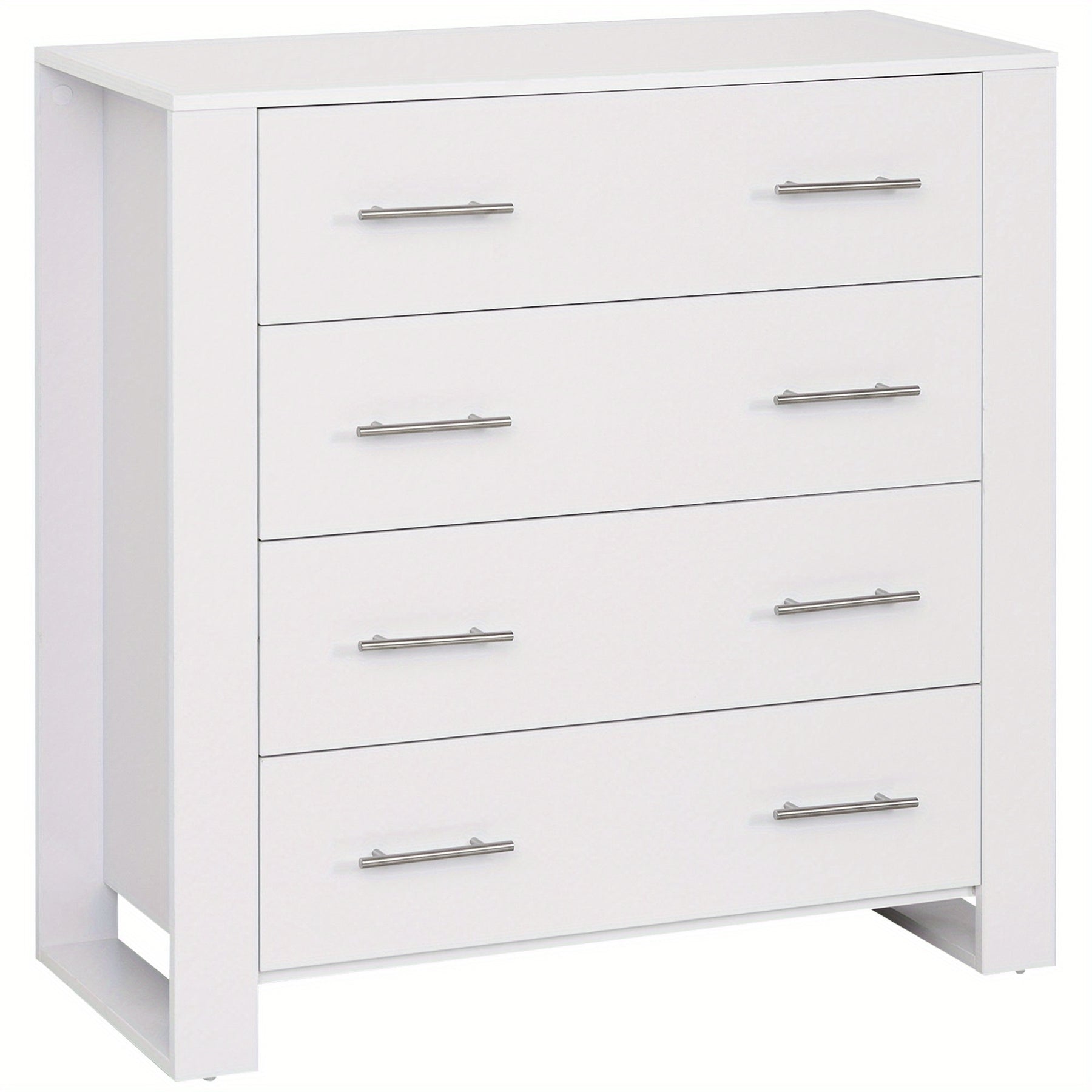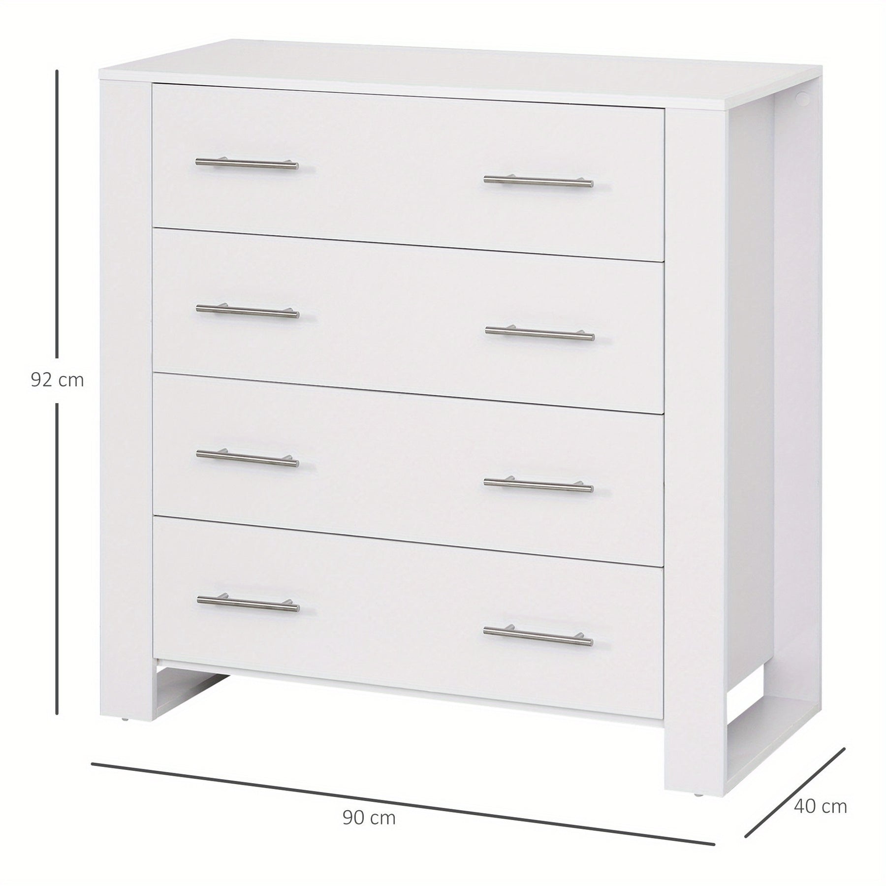 This white chest of 4 drawers offers a practical and stylish storage solution for bedrooms and living rooms alike. Crafted from durable wood-based panels with a hardwood particle board core, it ensures long-lasting stability and strength. The modern design is complemented by sleek metal handles and a sturdy base, making it a versatile freestanding unit that fits seamlessly into contemporary interiors. Ideal for organizing clothes and other essentials, this cabinet maximizes storage without compromising on aesthetics, providing both functionality and a clean, minimalist appearance for your space.