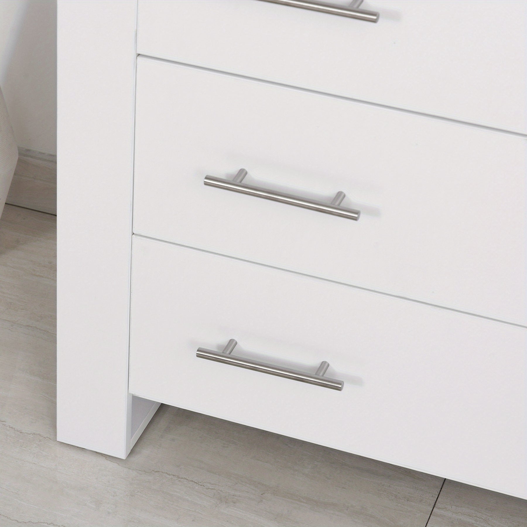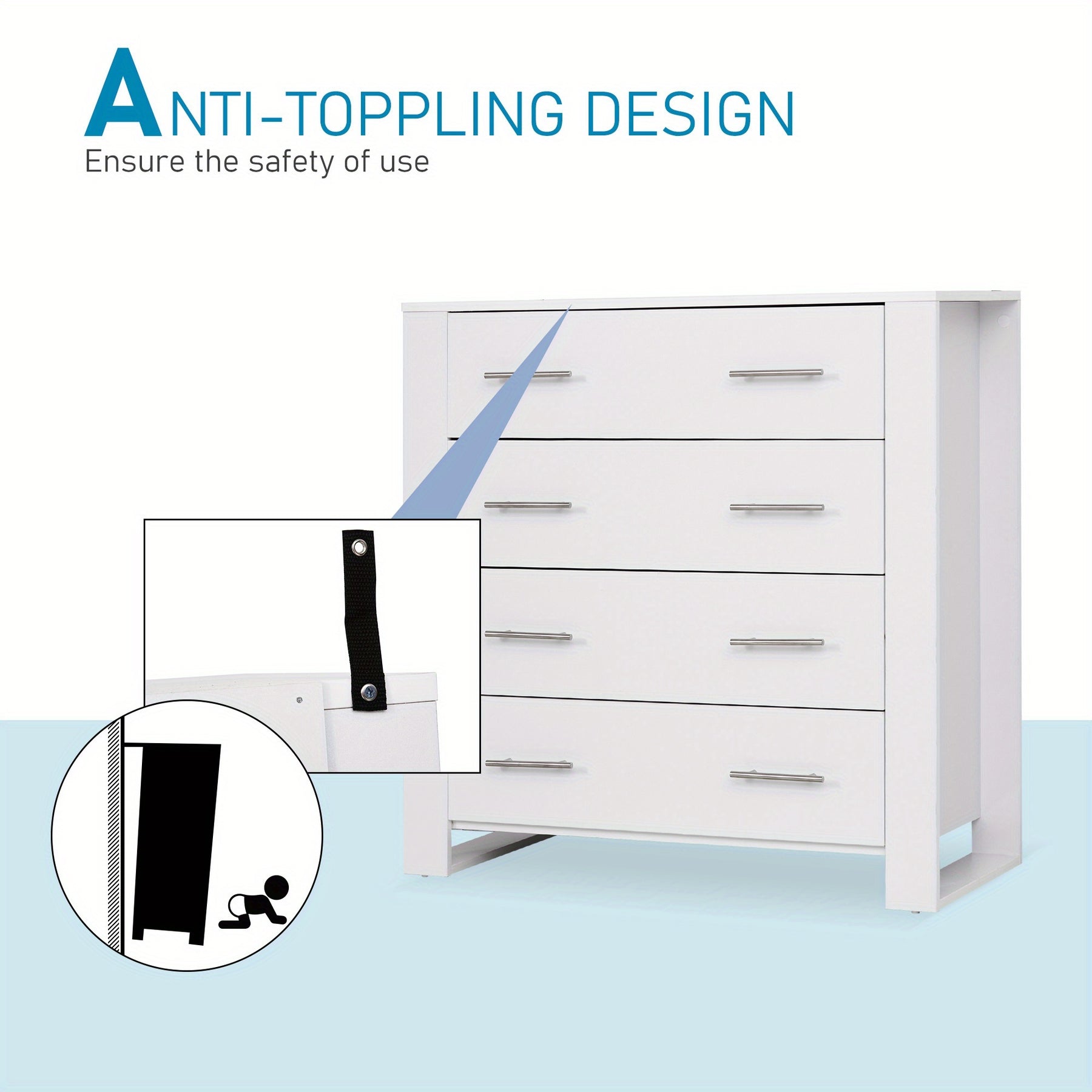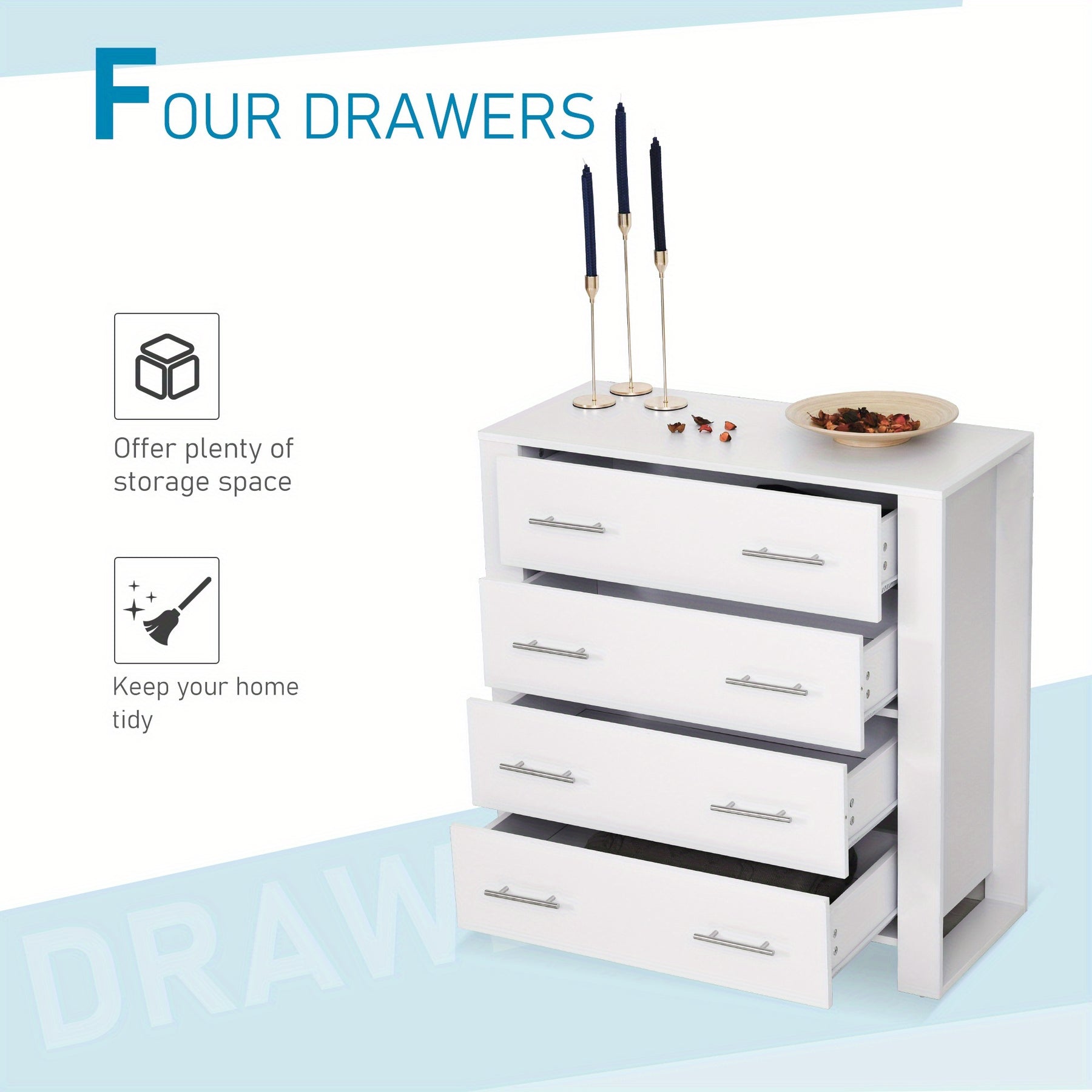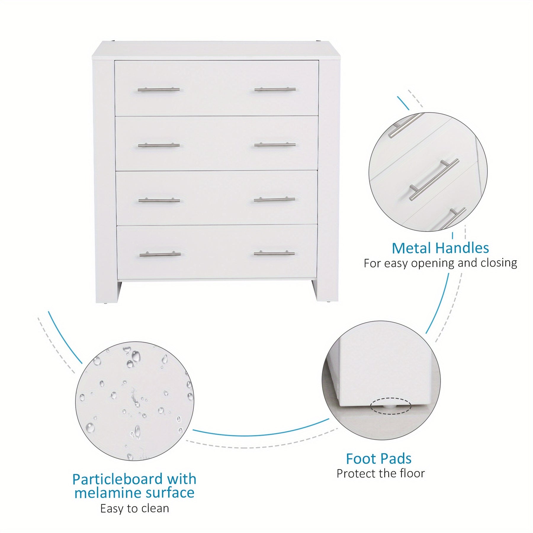 This white chest of 4 drawers offers a practical and stylish storage solution for bedrooms and living rooms alike. Crafted from durable wood-based panels with a hardwood particle board core, it ensures long-lasting stability and strength. The modern design is complemented by sleek metal handles and a sturdy base, making it a versatile freestanding unit that fits seamlessly into contemporary interiors. Ideal for organizing clothes and other essentials, this cabinet maximizes storage without compromising on aesthetics, providing both functionality and a clean, minimalist appearance for your space.
