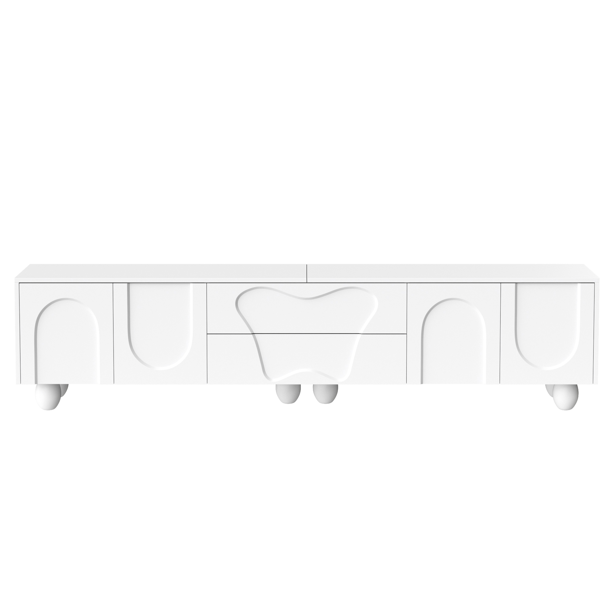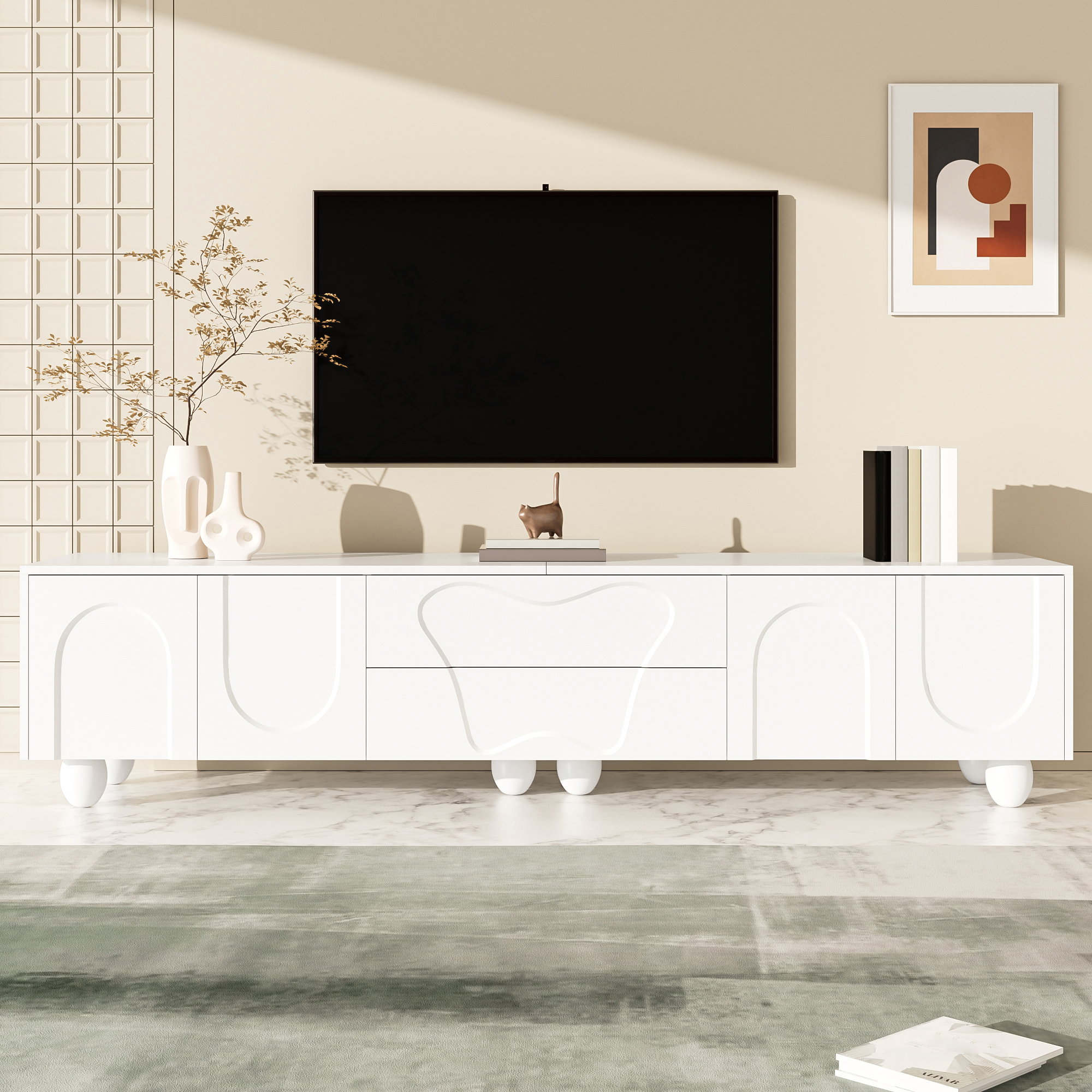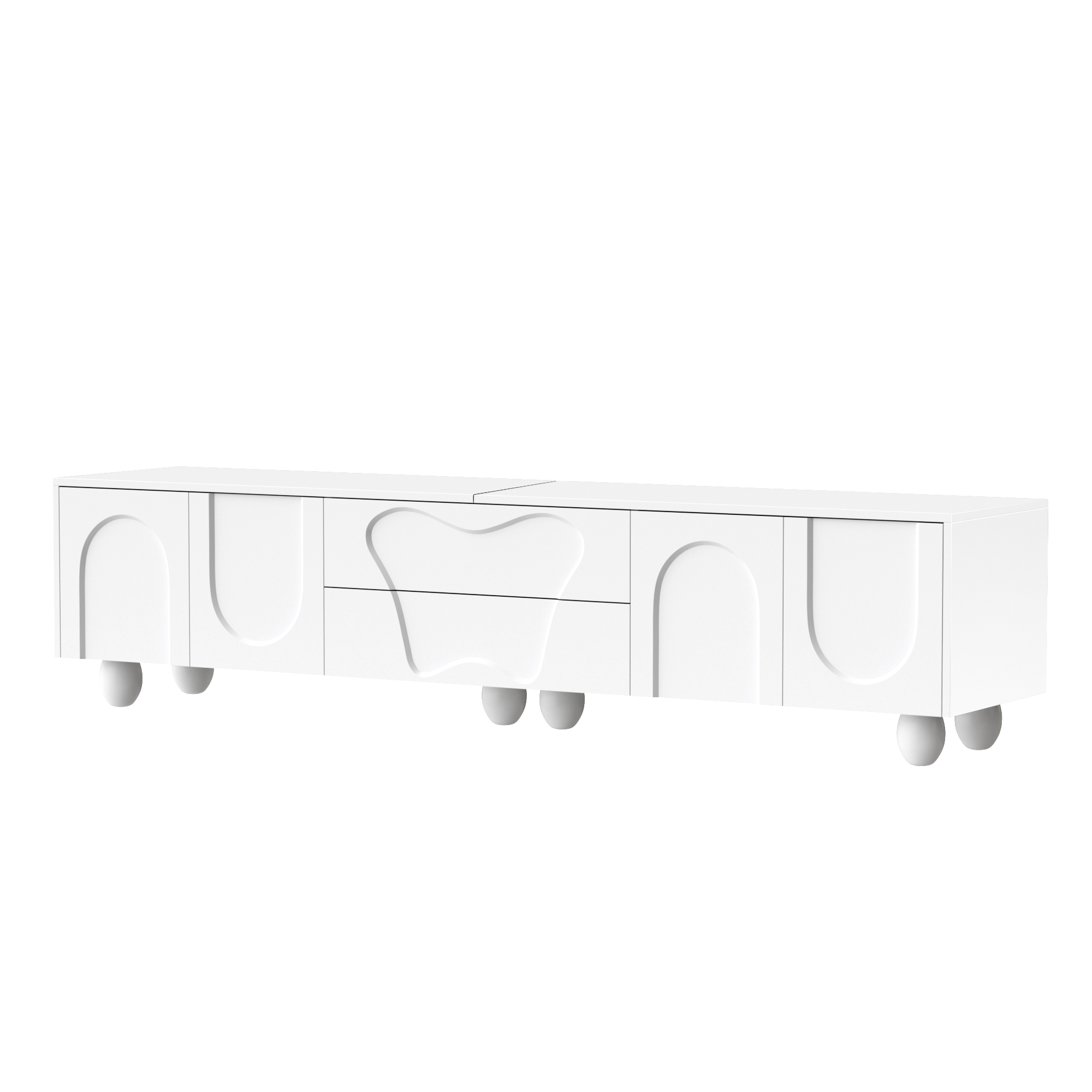 This white TV cabinet combines modern design with outstanding functionality. It is made from high-quality PB material and features a matte white surface that is easy to clean and scratch-resistant. The round wooden legs made of solid natural wood complement the modern design and ensure long-lasting stability. The unique design, with clean lines and curved doors, adds an elegant and fresh atmosphere to your living room. The spacious tabletop provides ample room for decorations, plants, and speakers without causing space constraints. This cabinet is not just a piece of furniture but also a true work of art that fits perfectly into modern and Nordic interior styles. The integrated storage space offers flexible solutions to keep your belongings neat and organized. Behind the curved doors, there is plenty of room for larger devices such as game consoles or routers, while the specially designed drawers store smaller items like remote controls, CDs, and batteries. With a length of 180 cm and a width of 40 cm, this cabinet fits perfectly into small to medium-sized rooms without making the space feel crowded. Especially in smaller apartments, it creates a sense of openness and order, while the natural wood grain and elegant design enhance the overall ambiance. Another highlight is the easy installation. Thanks to the clear instructions and the included tools, you can assemble the TV cabinet yourself quickly and effortlessly. Ideal for anyone who wants to furnish their space in a stylish yet practical way.