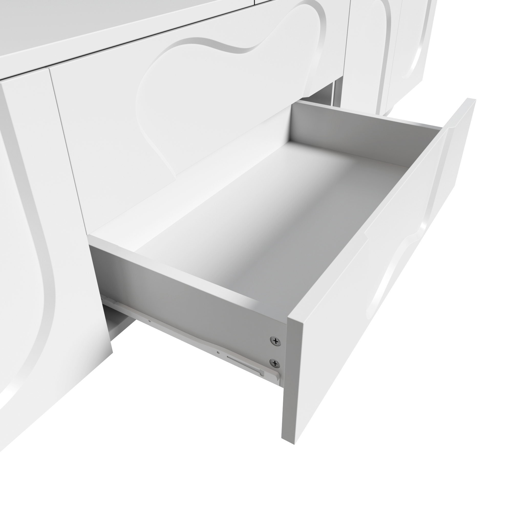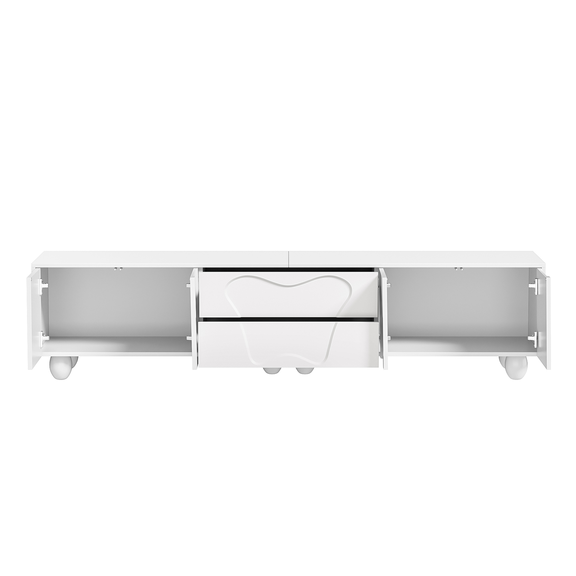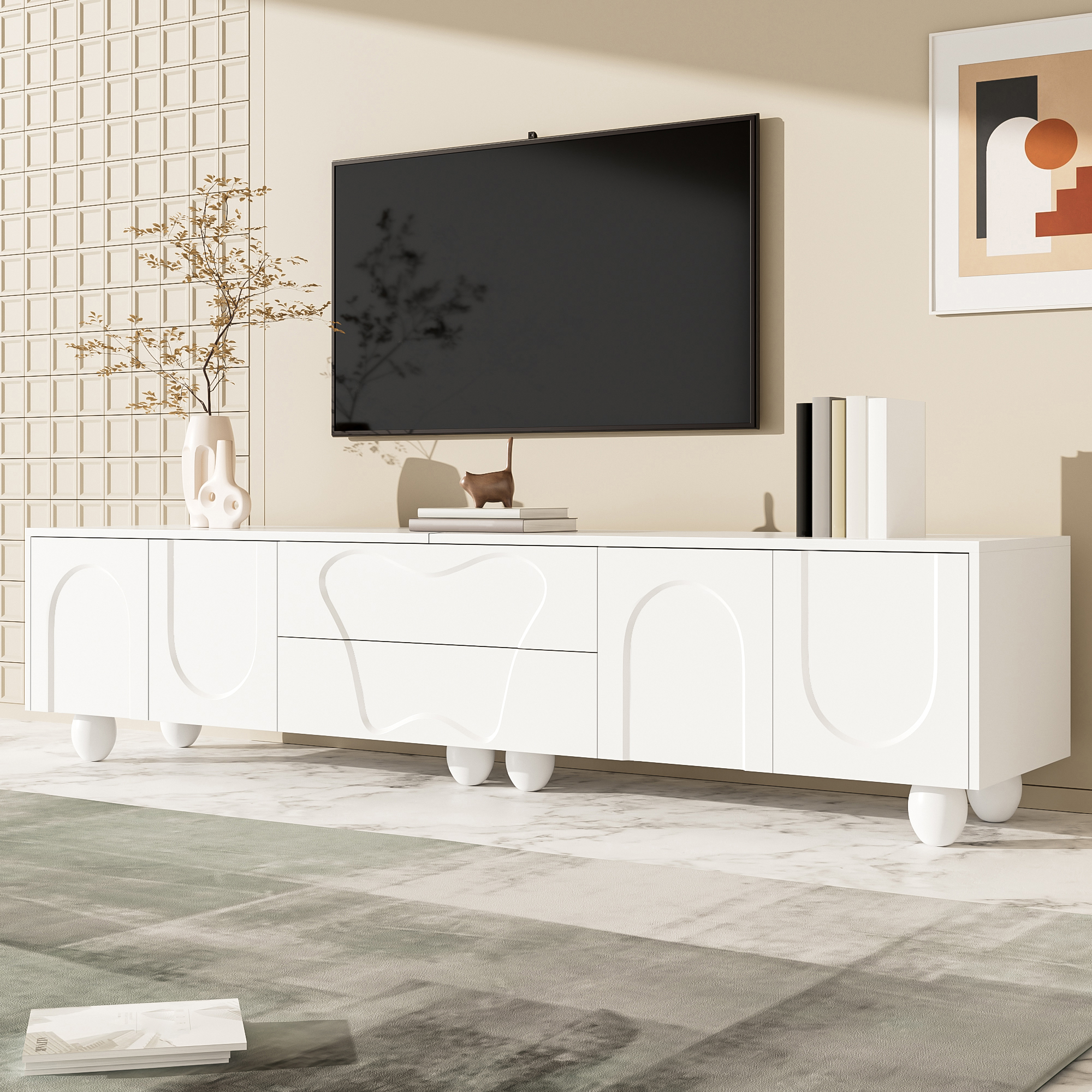 This white TV cabinet combines modern design with outstanding functionality. It is made from high-quality PB material and features a matte white surface that is easy to clean and scratch-resistant. The round wooden legs made of solid natural wood complement the modern design and ensure long-lasting stability. The unique design, with clean lines and curved doors, adds an elegant and fresh atmosphere to your living room. The spacious tabletop provides ample room for decorations, plants, and speakers without causing space constraints. This cabinet is not just a piece of furniture but also a true work of art that fits perfectly into modern and Nordic interior styles. The integrated storage space offers flexible solutions to keep your belongings neat and organized. Behind the curved doors, there is plenty of room for larger devices such as game consoles or routers, while the specially designed drawers store smaller items like remote controls, CDs, and batteries. With a length of 180 cm and a width of 40 cm, this cabinet fits perfectly into small to medium-sized rooms without making the space feel crowded. Especially in smaller apartments, it creates a sense of openness and order, while the natural wood grain and elegant design enhance the overall ambiance. Another highlight is the easy installation. Thanks to the clear instructions and the included tools, you can assemble the TV cabinet yourself quickly and effortlessly. Ideal for anyone who wants to furnish their space in a stylish yet practical way.