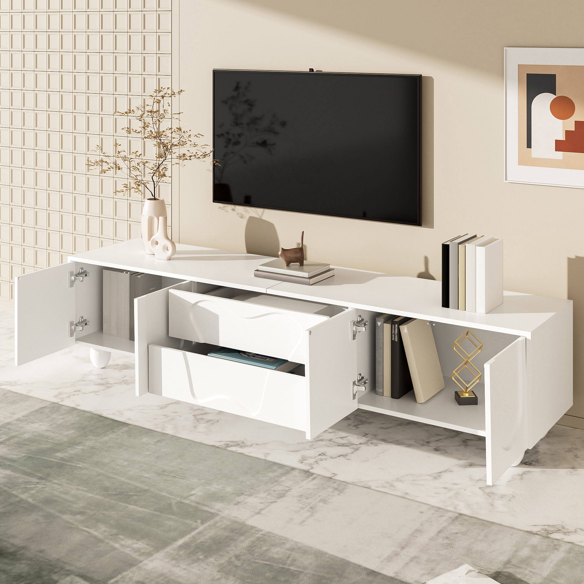 Product Name:180 cm White TV Cabinet with Wooden Legs – A minimalist and elegant TV cabinet with ample storage space, a unique design, and flexible storage solutions for a stylish living room.