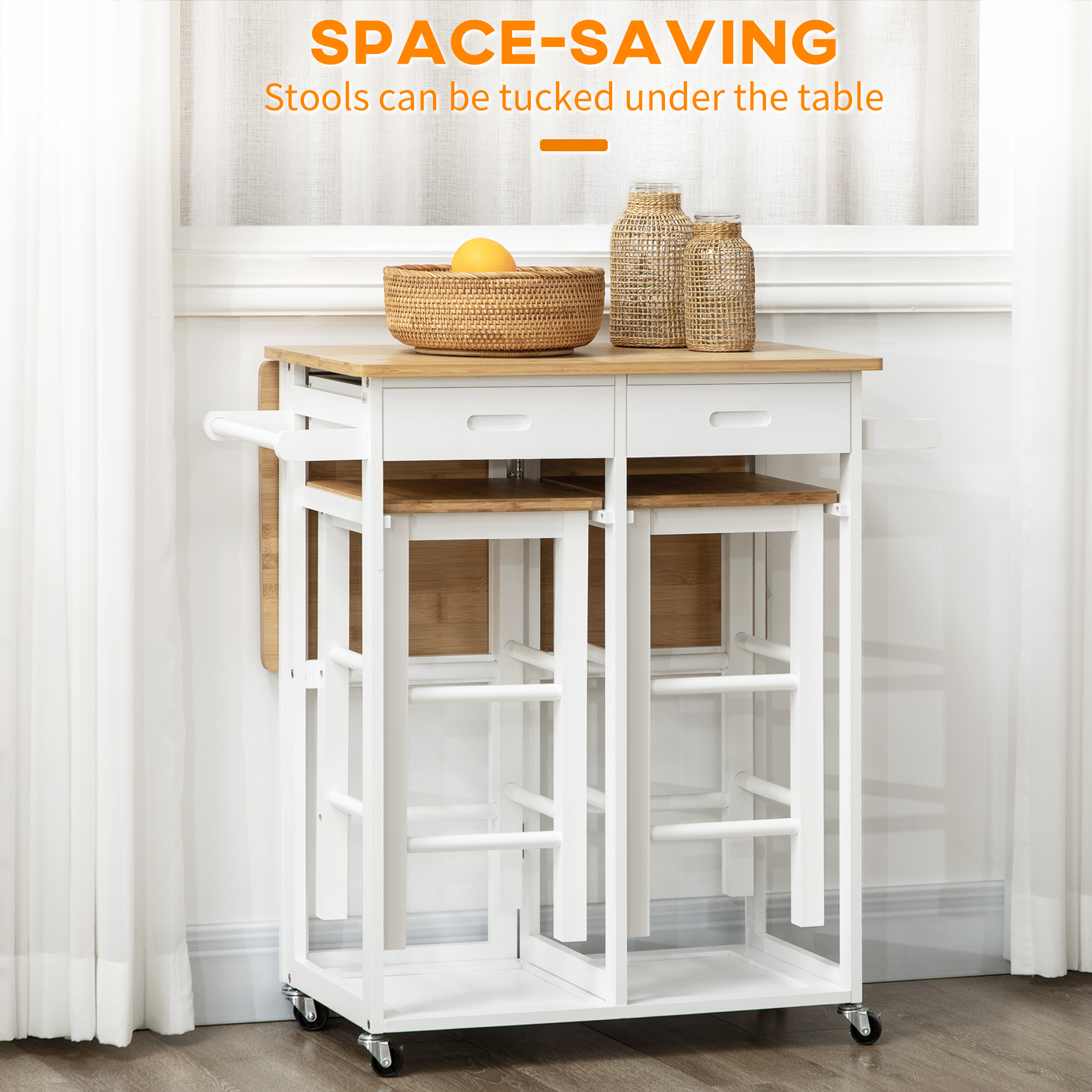 A 2-in-1 set to relax and dine with company - say hello to this breakfast bar set. It comes with a drop-leaf table and two stools - room for you and company. Lift up the table top to extend the dining space; use the two drawers to store smaller items close to you for convenience. The two stools slide into the table - a compact set which tucks neatly into corners when not needed. Complete with lockable wheels to move it around and set into a place of your choice.