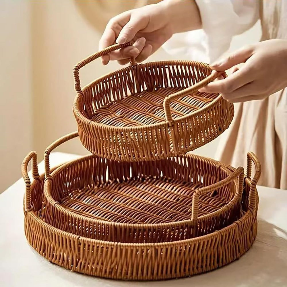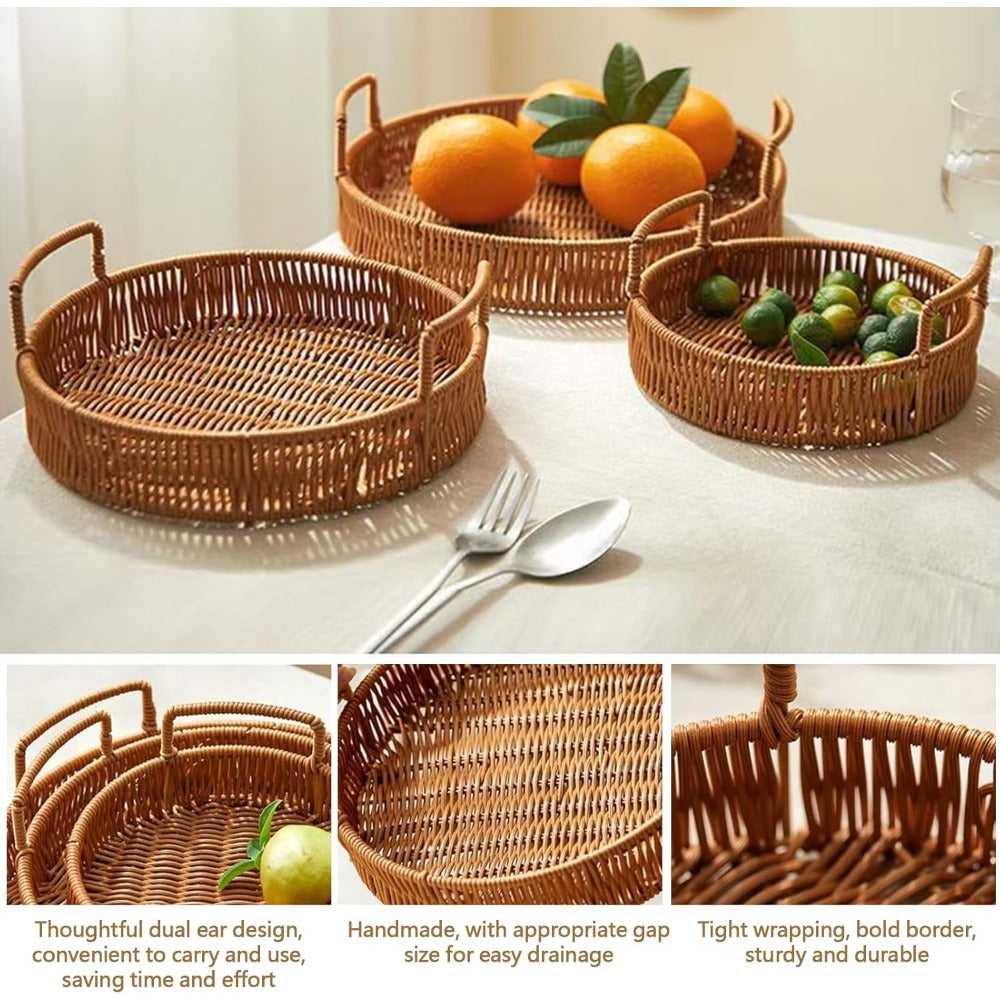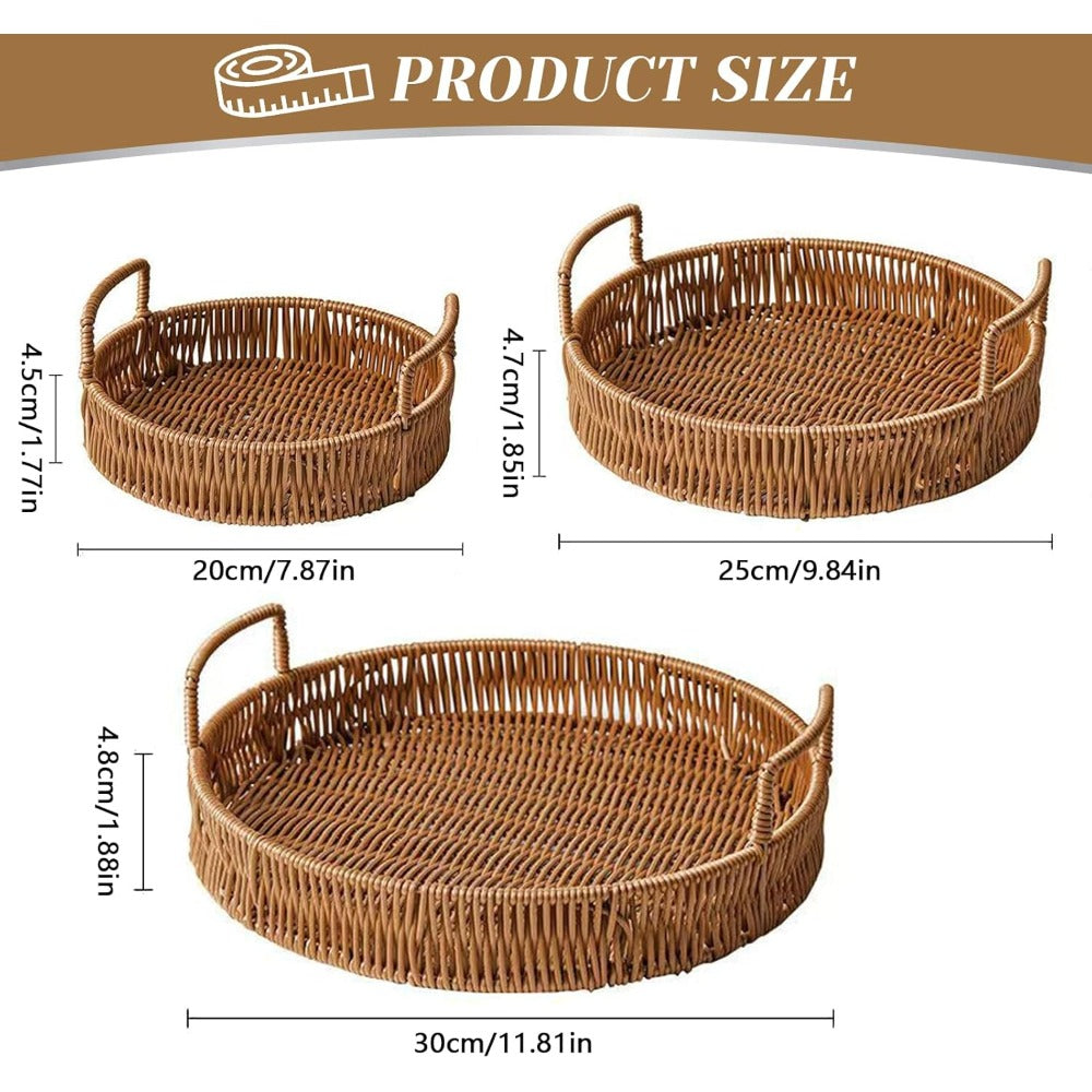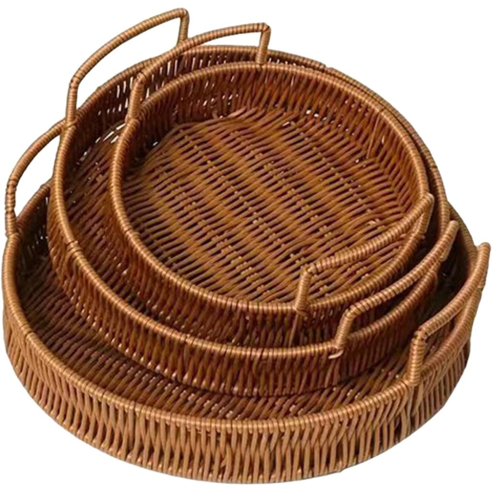 A versatile three-piece serving and storage collection crafted from durable imitation rattan. The graduated set—20cm, 25cm, and 30cm—features hand-woven construction with integrated handles for easy transport. Ideal for displaying bread, fruit, or tabletop essentials, each tray doubles as functional décor for coffee tables and kitchen counters. Lightweight plastic construction mimics natural rattan aesthetics while offering practical durability. Made in the United Kingdom.